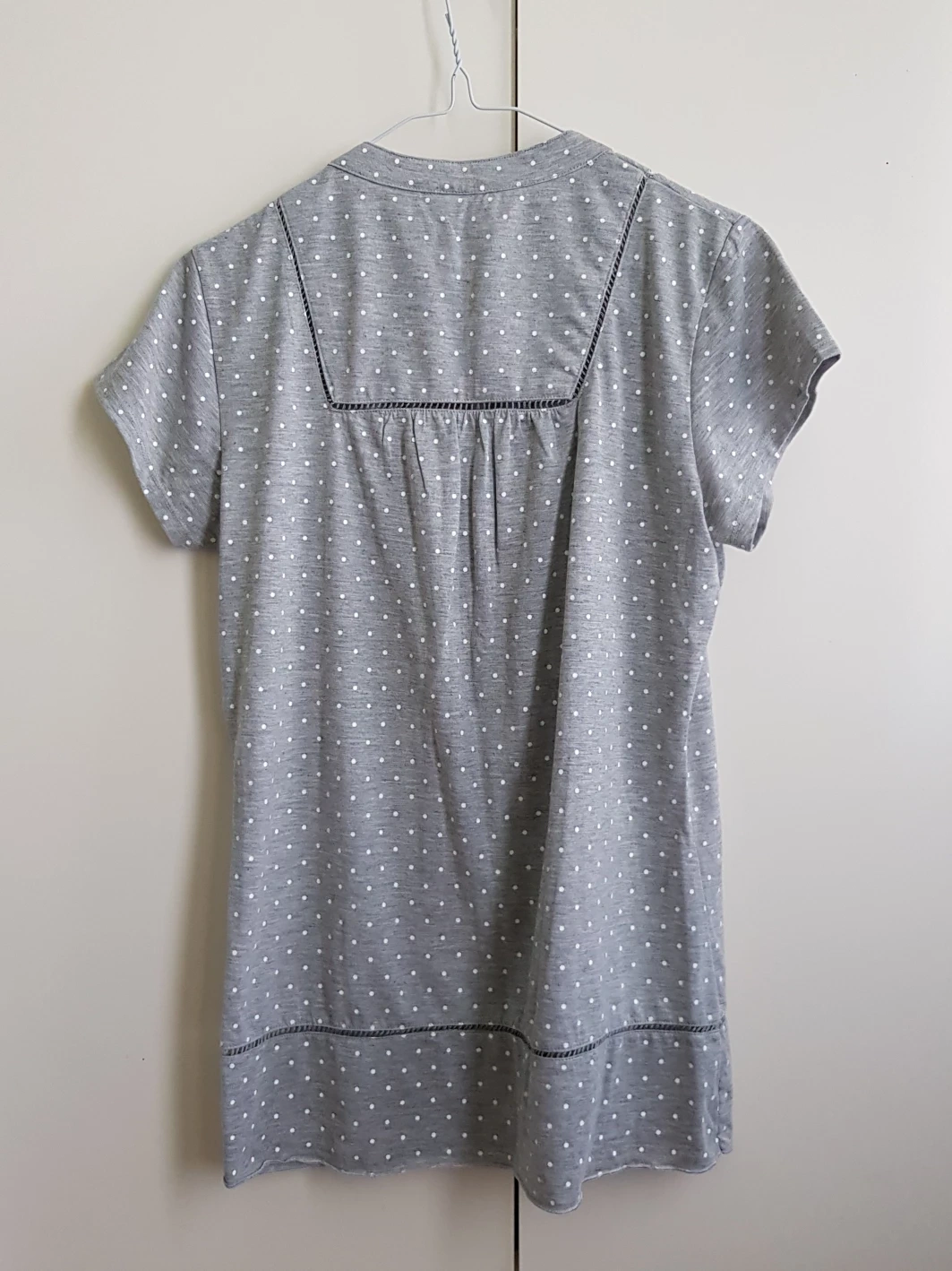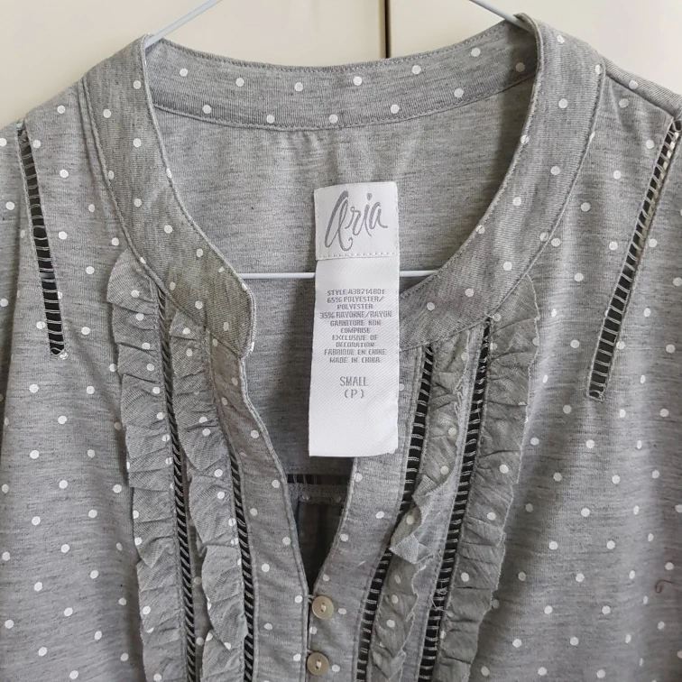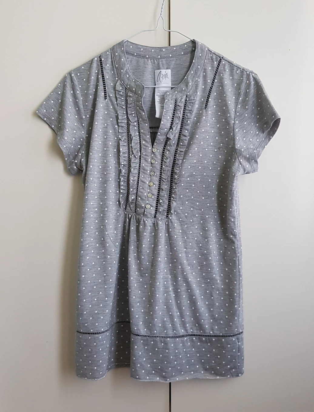 1000+Size small, short sleeve top with a white polka dot pattern. Ruffled front with stitched openings. Material: 65% polyester, 35% rayon Colour: Gray with white polka dots Cash only Pets free, smoke free home Pickup near or at Cornell Public Library, or Delivery to Markham, Pickering, or Stouffville