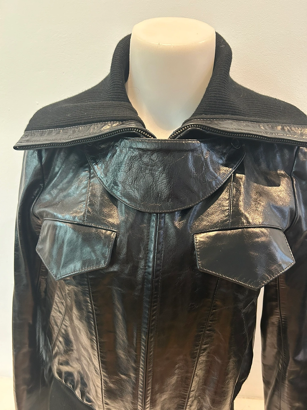 This is a black leather jacket with a large collar. It features a zipper closure, two front pockets, and elastic at the cuffs and waist. It is in new condition.