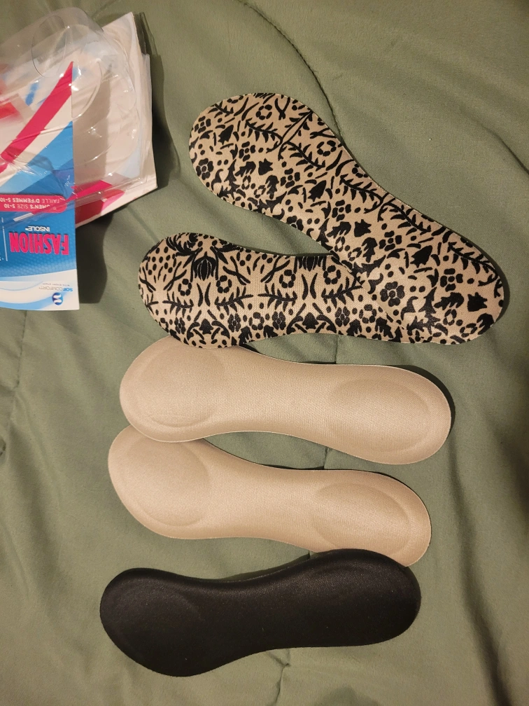 Three pairs of SofComfort Fashion Insoles, in women's size 5-10. Each pair has a different design: black with floral print, beige, and black.