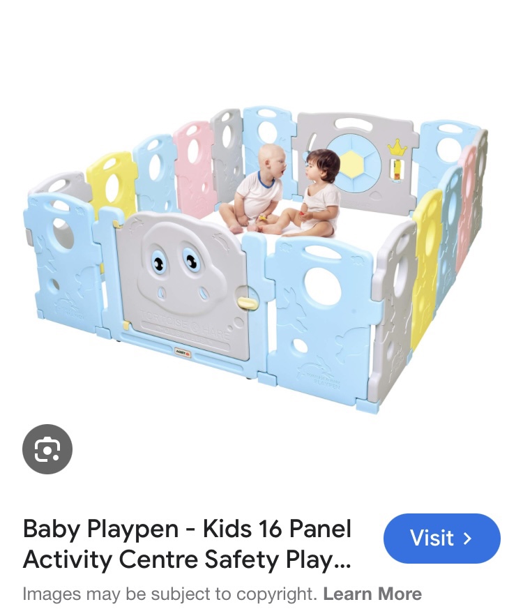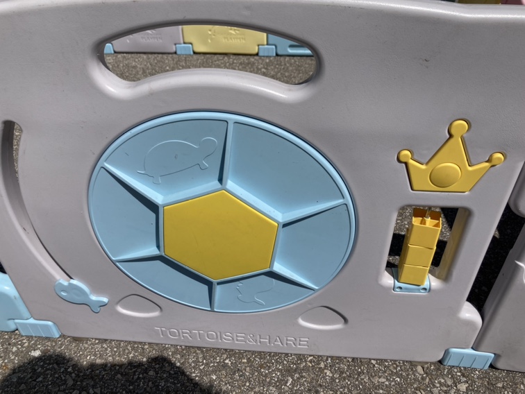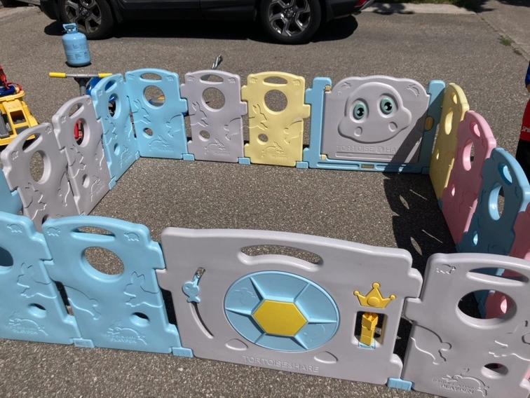 Playpen with various activity centres and a gate. Can be used for indoors or outdoors. Modular with opportunity to reconfigure to different sizing.