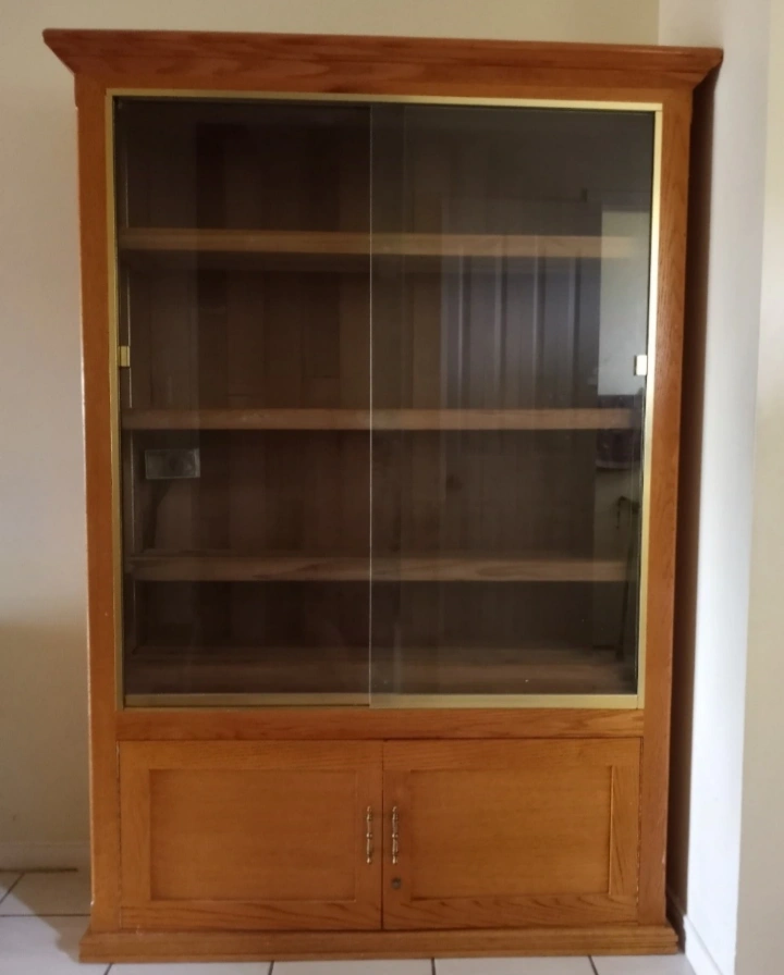 A large wooden cabinet with glass sliding doors. There are four shelves behind the doors and two cabinets below. Originally a cigar humidor display cabinet. Have been using it as a regular living room display cabinet.  The cabinet is clean, and is from a smoke-free, pet-free home.