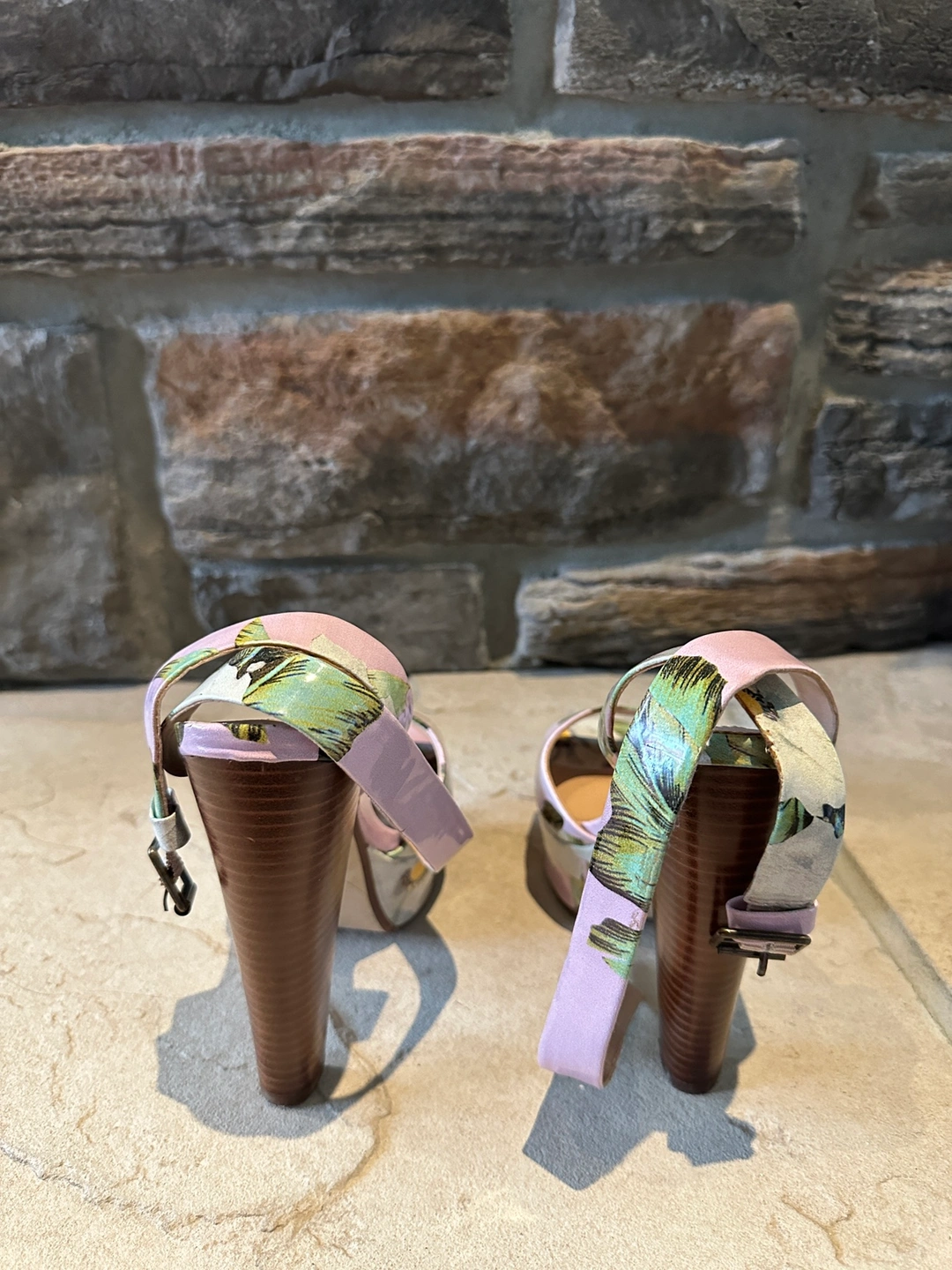 Floral print heeled sandals with ankle strap and buckle closure.