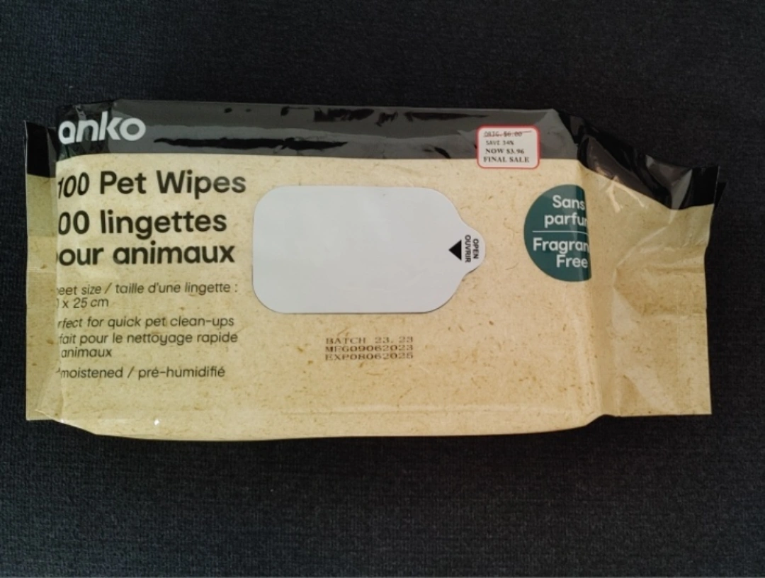 Anko brand pet wipes. Unscented. 100 wipes in package.