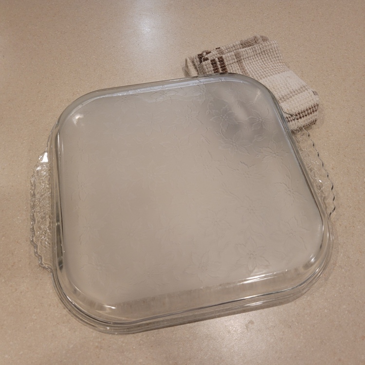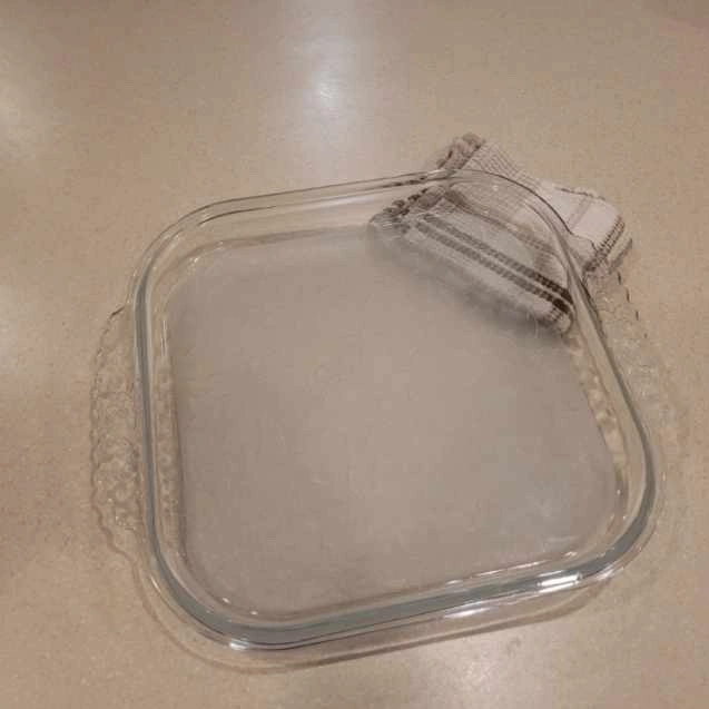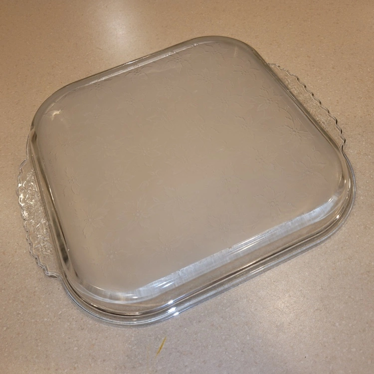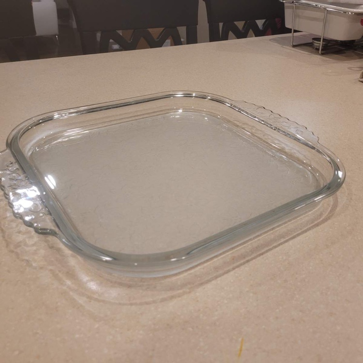 A square glass baking dish with handles. It has a fluted edge and is perfect for baking cakes, casseroles, and other dishes. It is made of durable glass that is safe for the oven, microwave, and dishwasher.