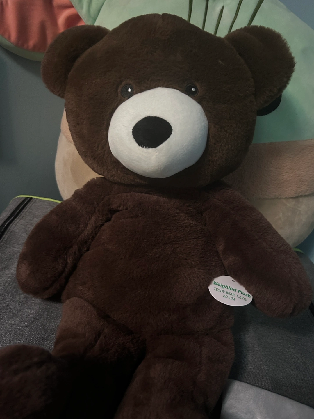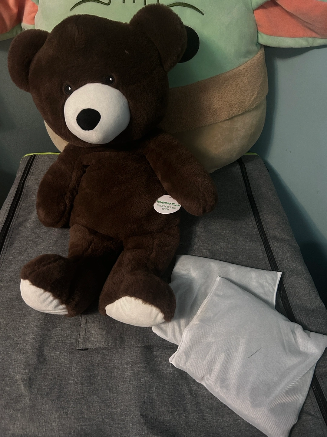 Large brown weighted plush bear. Comes with two weighted bags that are designed to be put inside the bear, there’s already one weighted bag in the bear, comes with the extra two shown in the picture. Asking $10