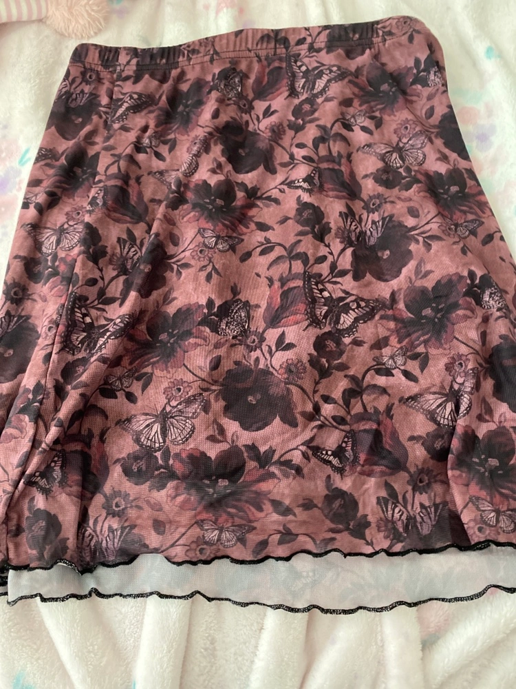 A floral skirt with butterflies and a mesh overlay. The skirt has an elastic waistband. The skirt is lined with a black fabric.