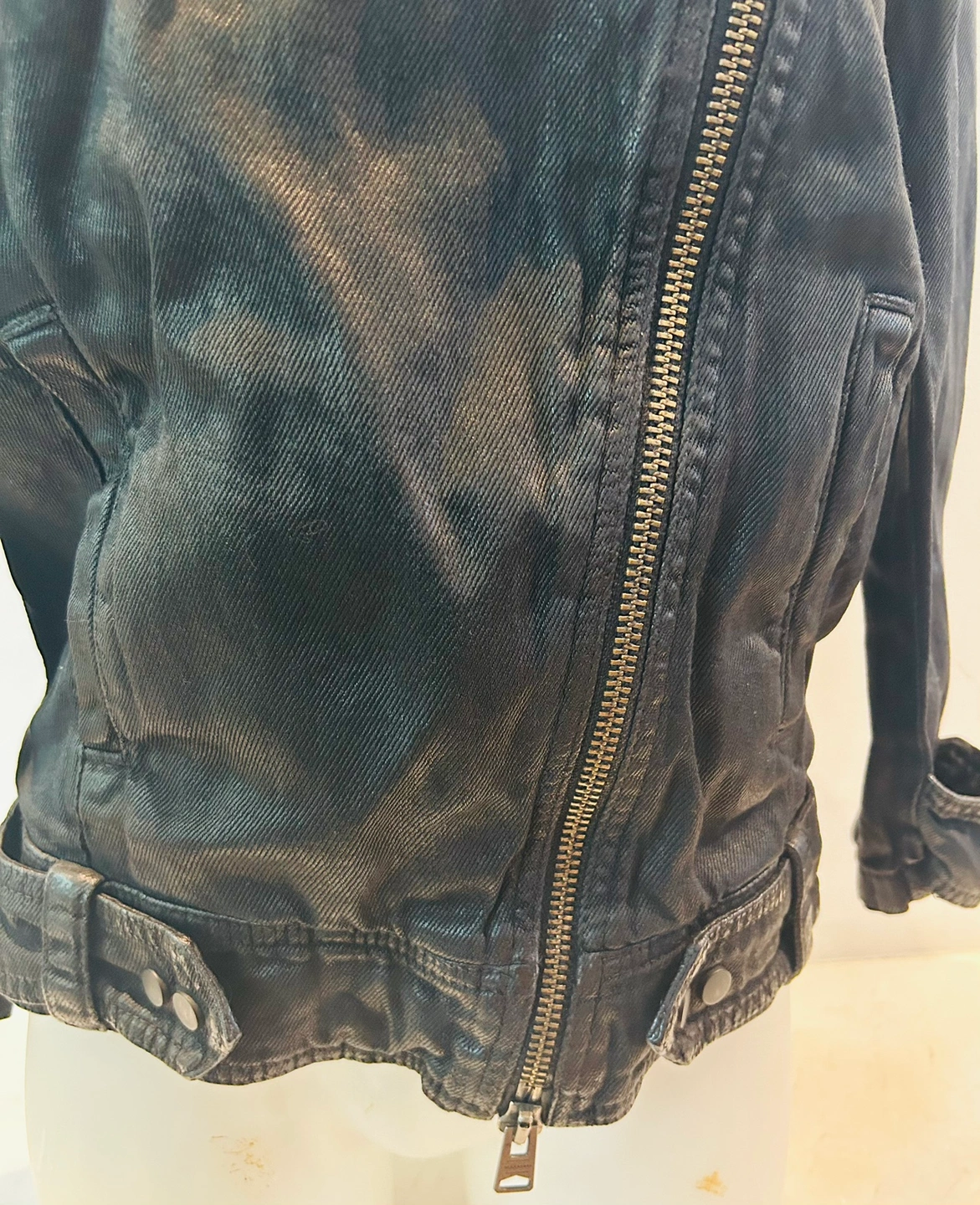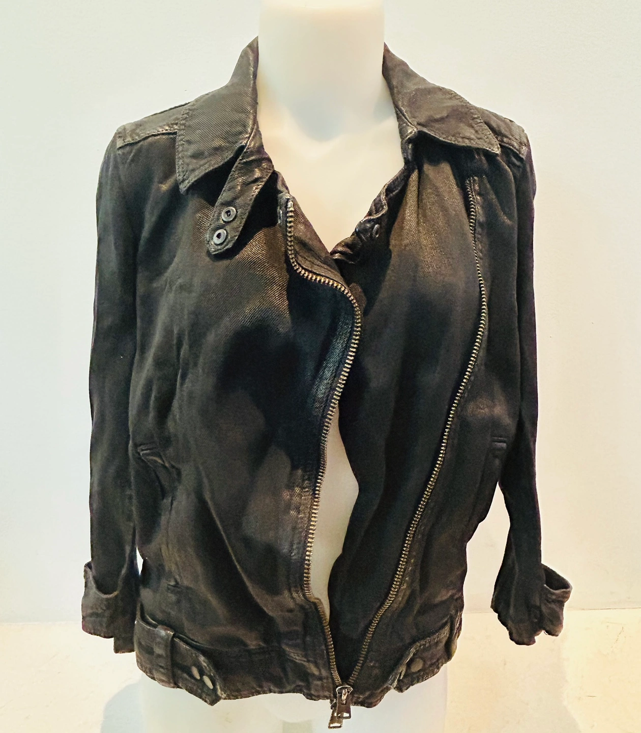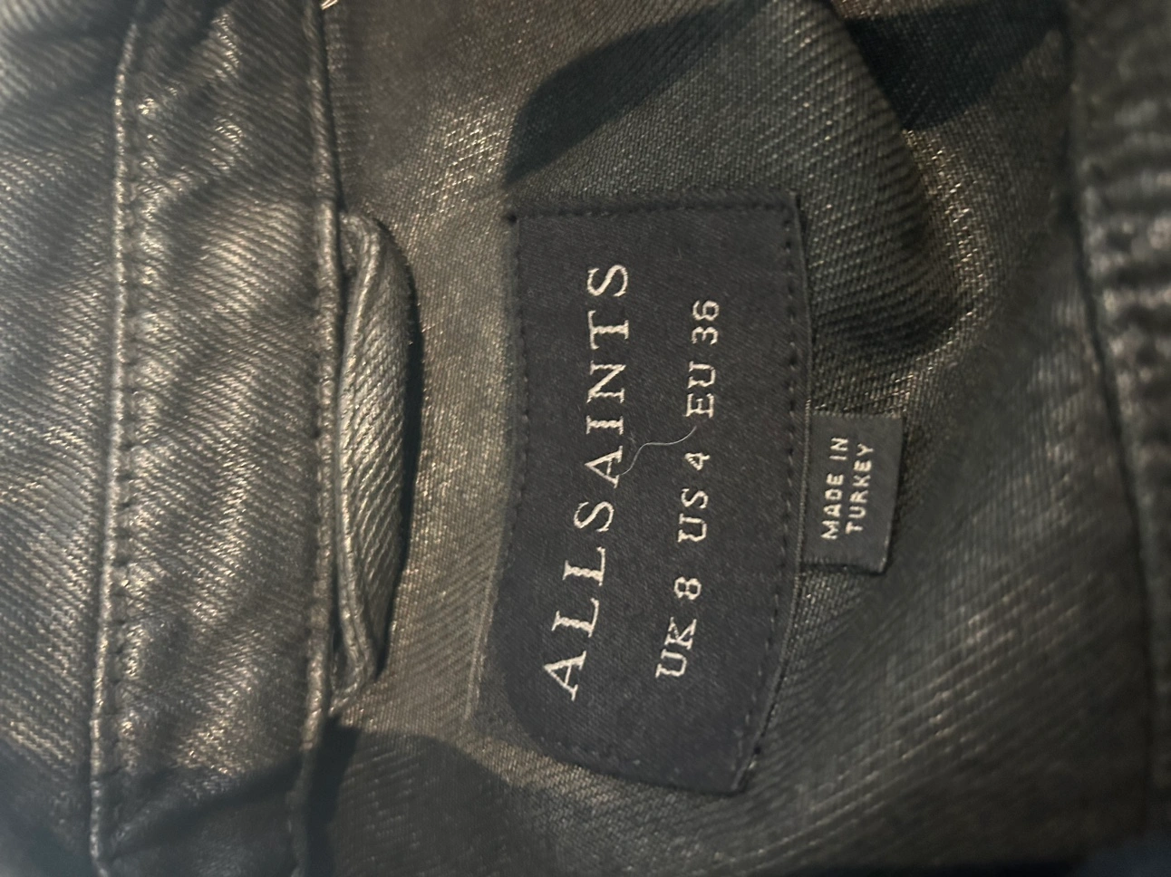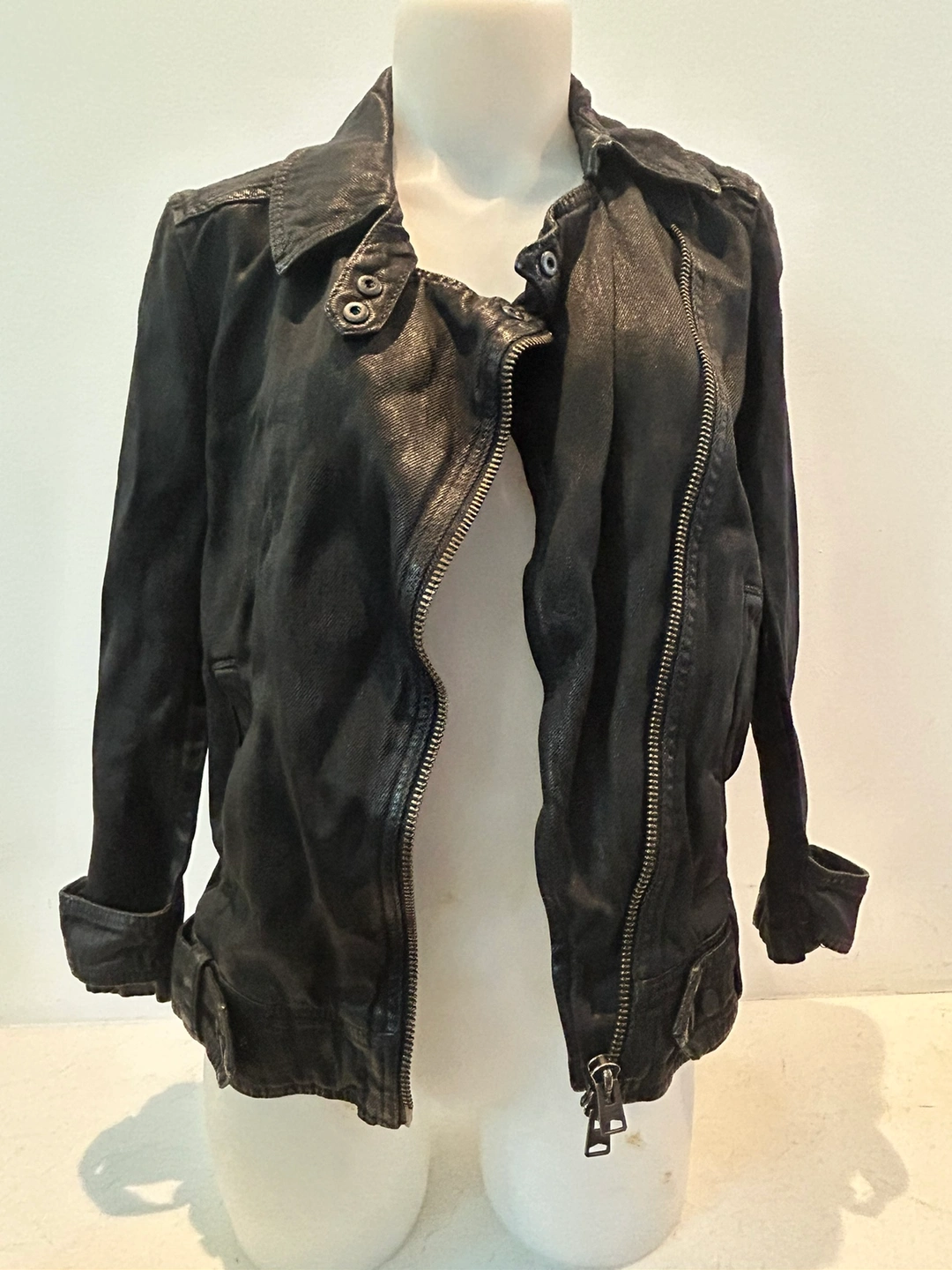 An “all saints” black denim jacket with a zipper closure and a collared neckline. It has a belt at the waist and a waxed coat finish. . The sleeves are long and have a rolled cuff. Has an intentionally
