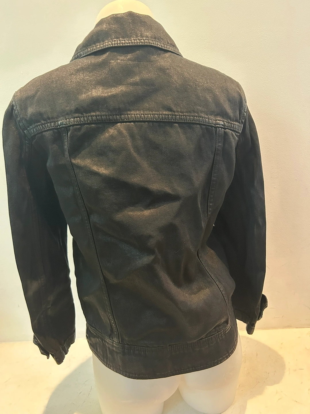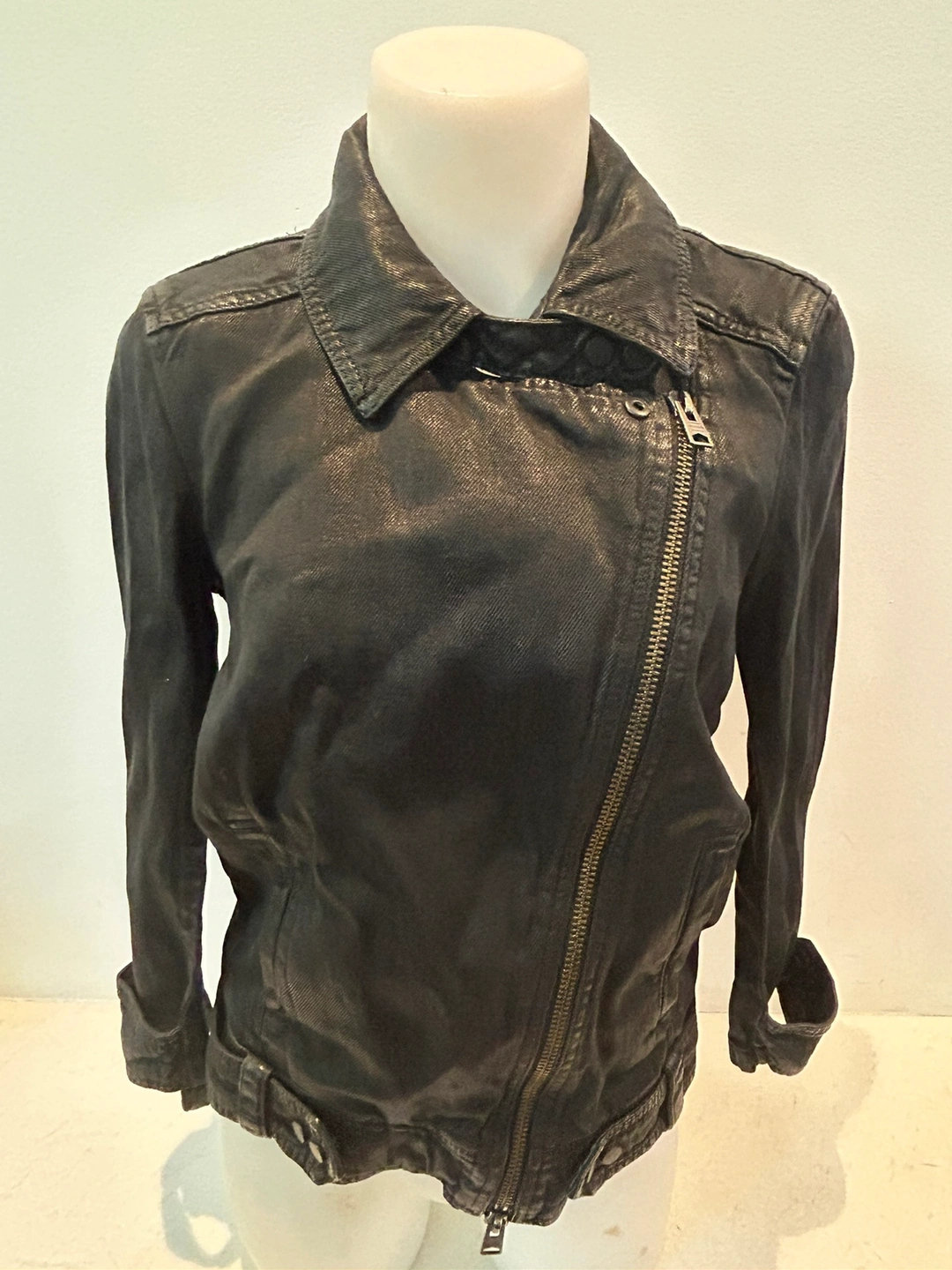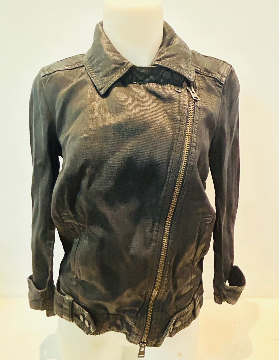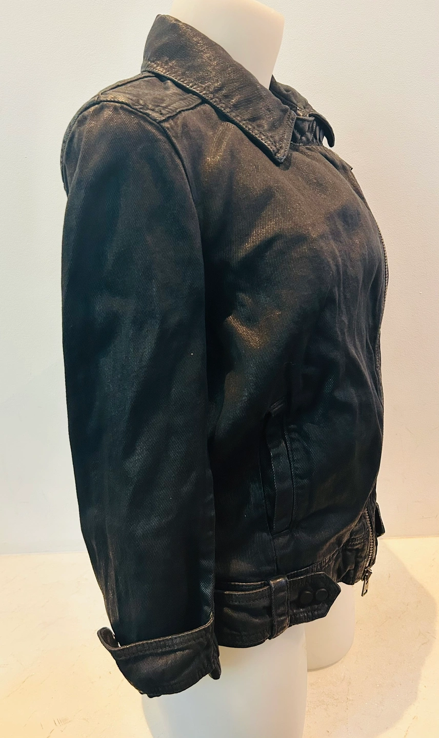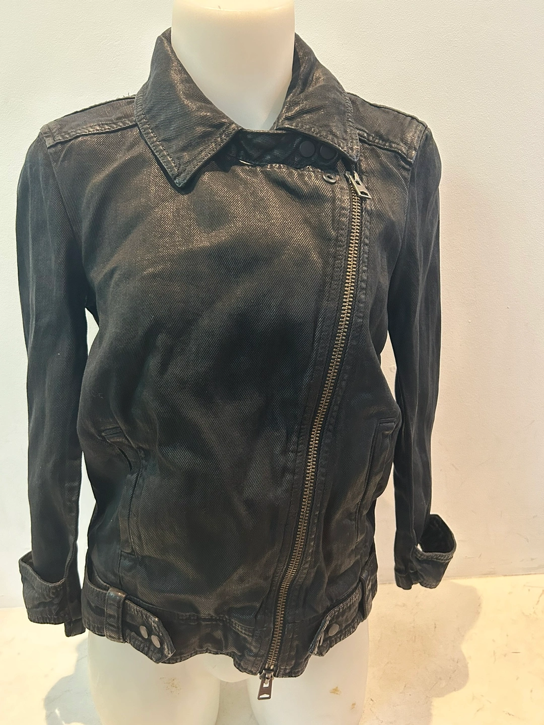 An “all saints” black denim jacket with a zipper closure and a collared neckline. It has a belt at the waist and a waxed coat finish. . The sleeves are long and have a rolled cuff. Has an intentionally