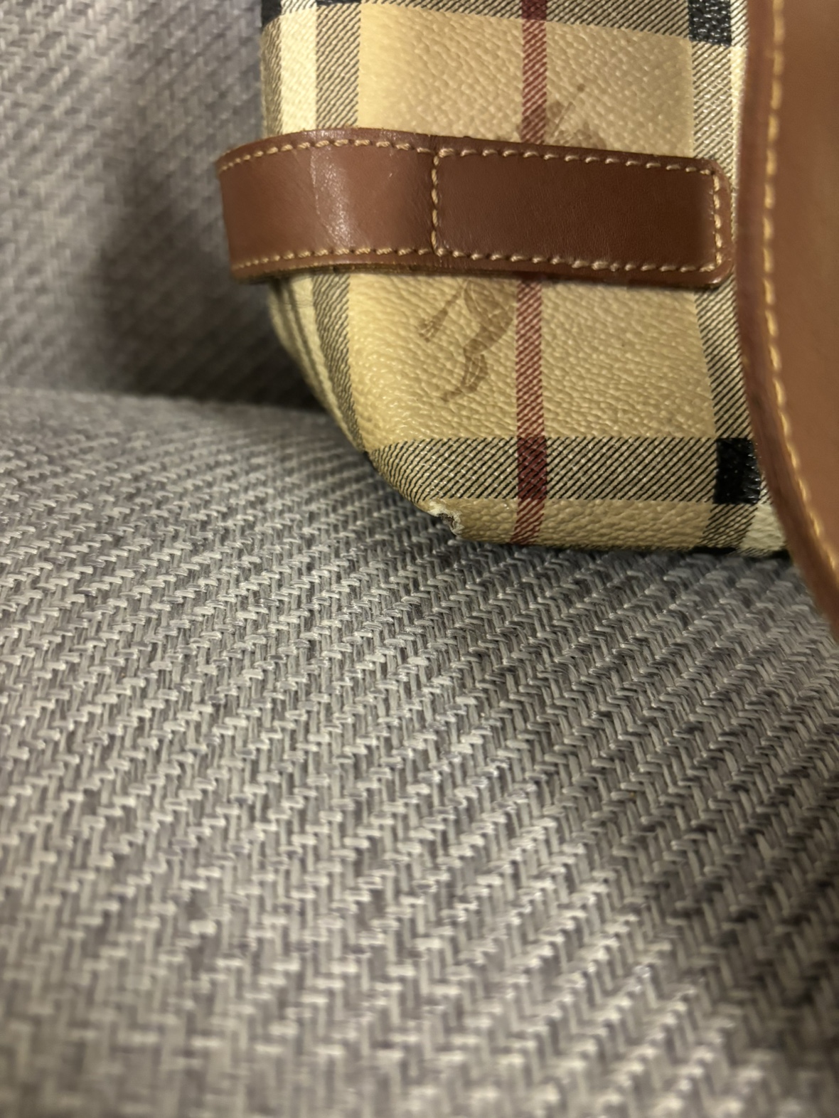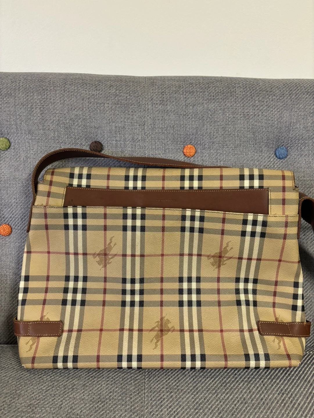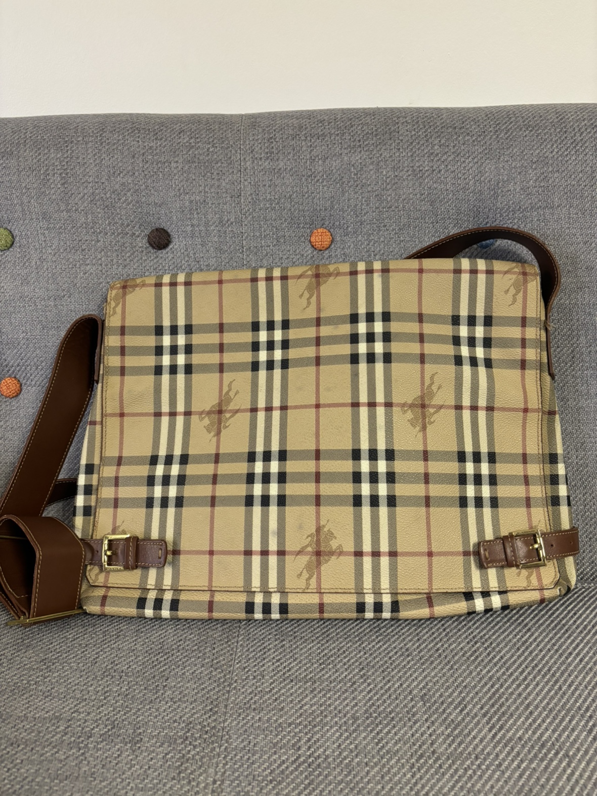 A classic Burberry messenger bag with the Haymarket coated canvas and leather accents. The bag has a spacious interior and a long adjustable strap. There is some repair do be done at the back pocket but you can still use the main compartiment no problem.