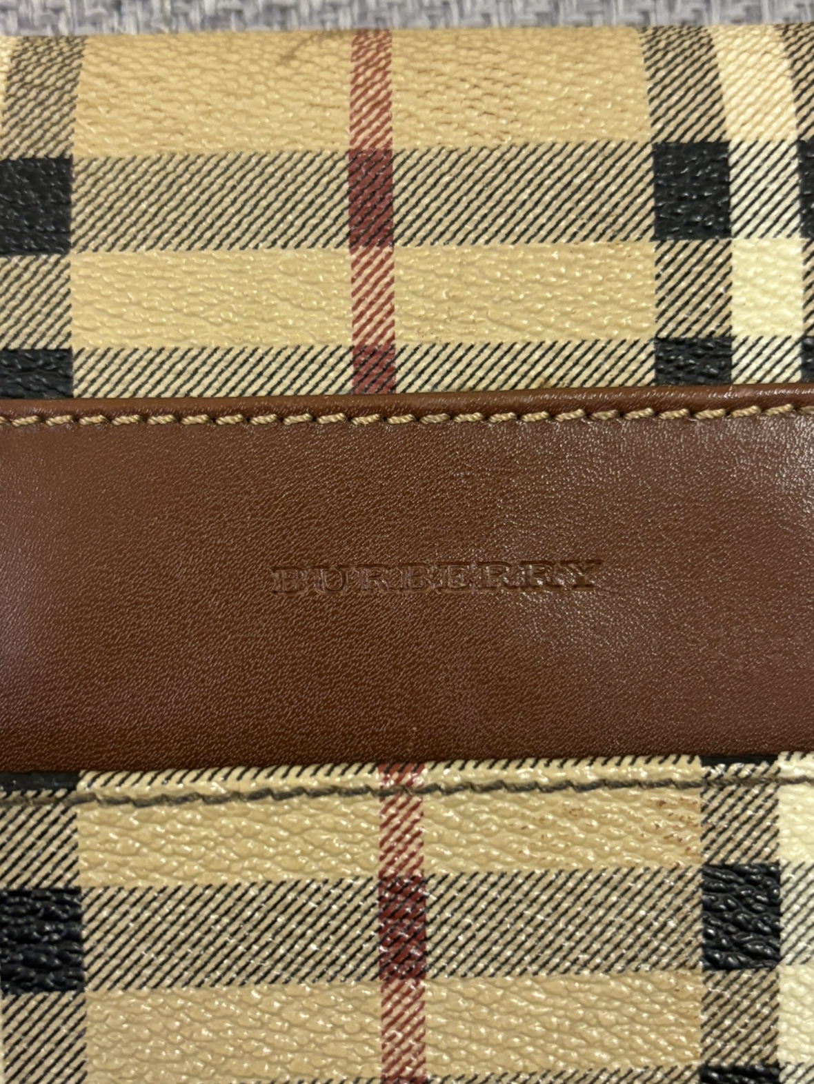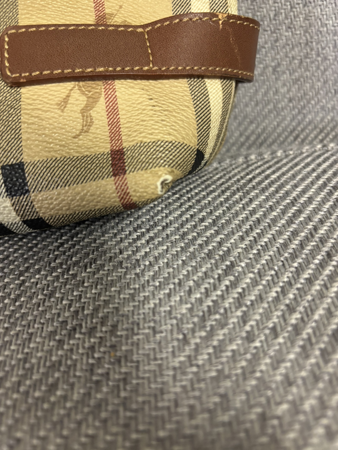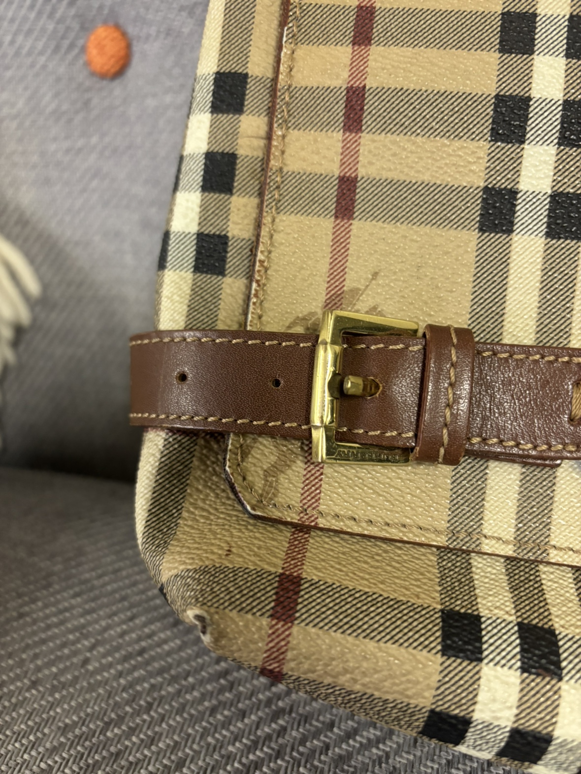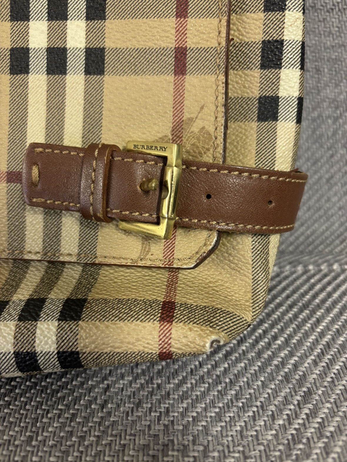 A classic Burberry messenger bag with the Haymarket coated canvas and leather accents. The bag has a spacious interior and a long adjustable strap. There is some repair do be done at the back pocket but you can still use the main compartiment no problem.