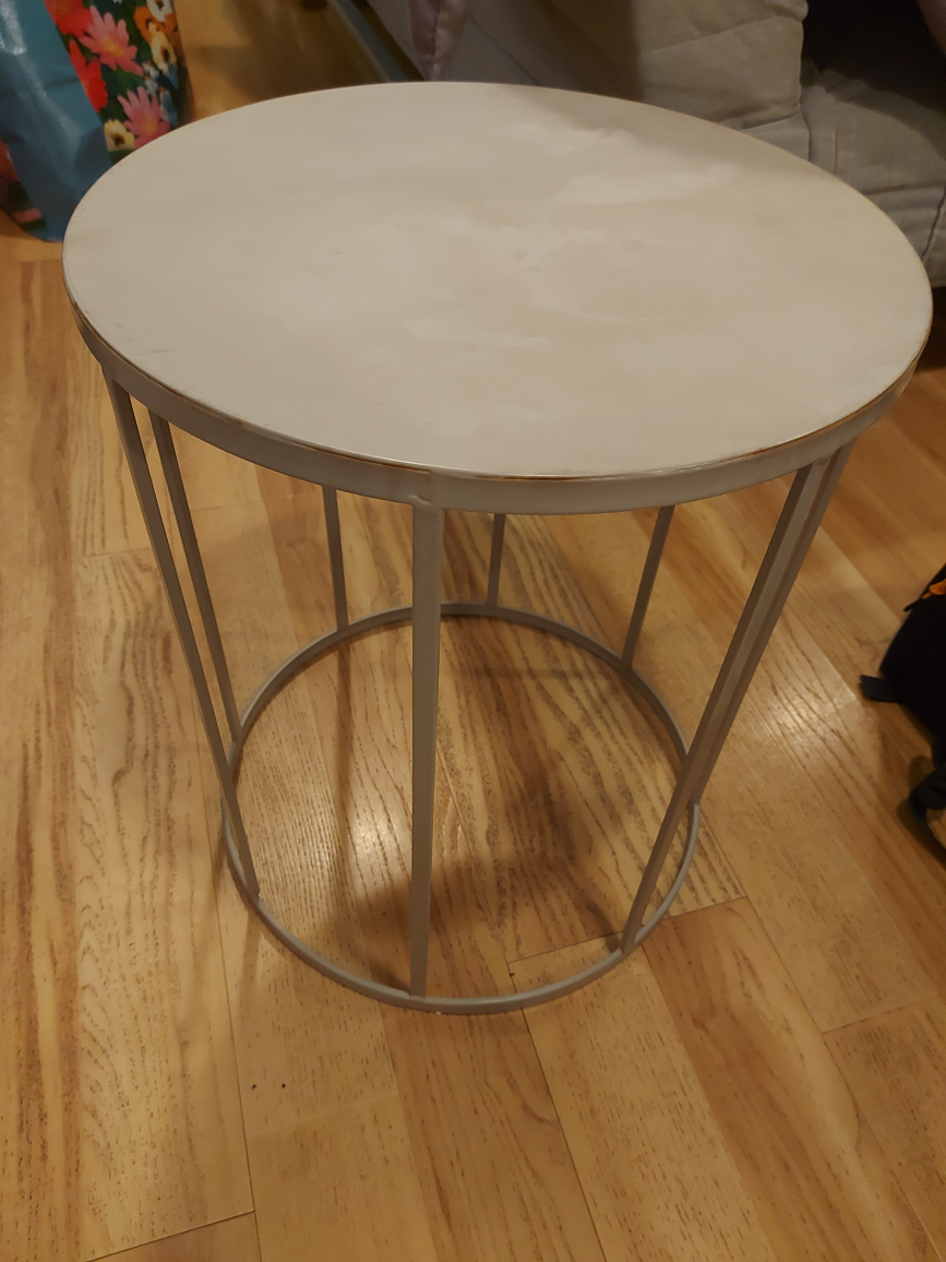 A small round end table in a grey colour with a metal frame. used outdoors on balcony. some marks on the top but is structurally all good.