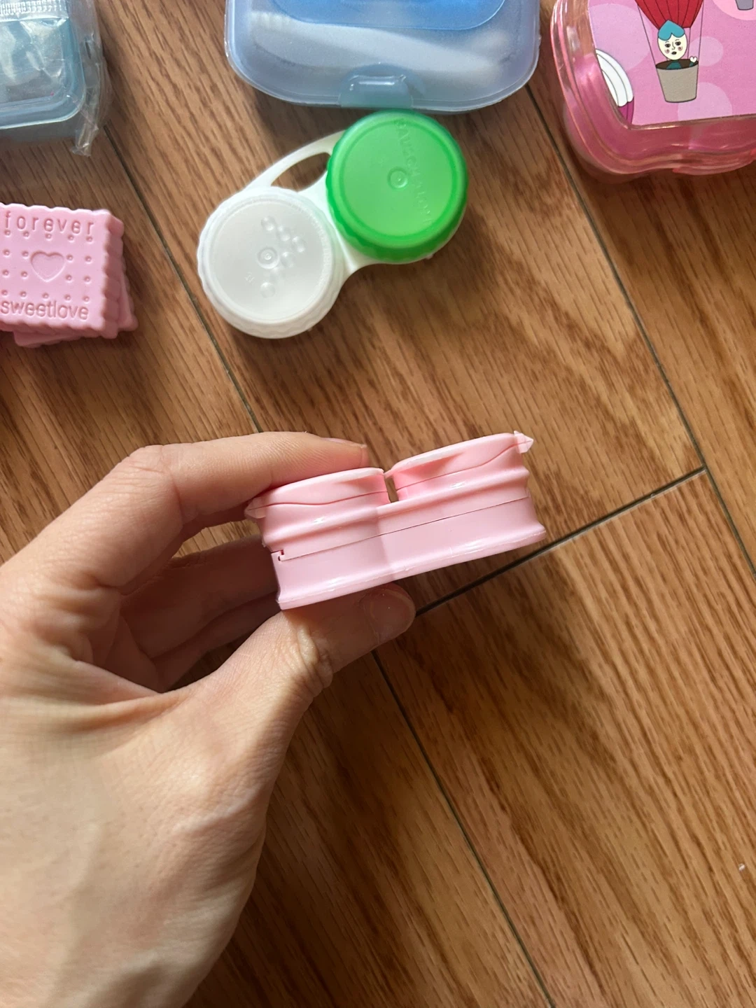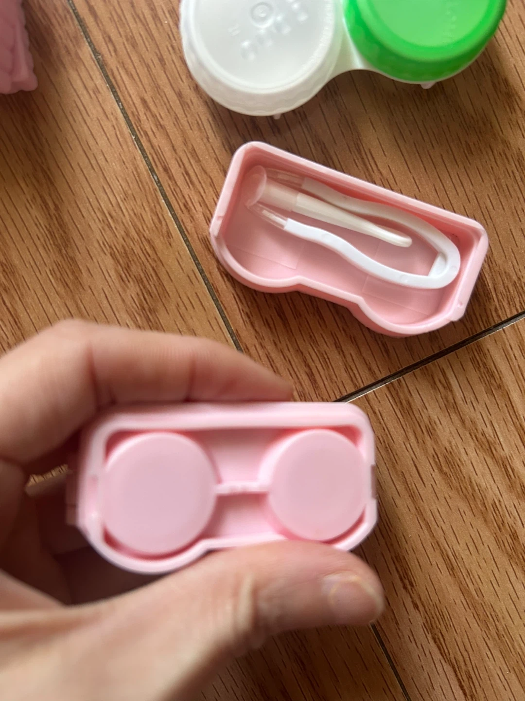 Various contact lens cases and travel-sized solution bottles are included. These cases come in different colours and designs, some featuring animal shapes. Tweezers and small applicators are also part of the lot.