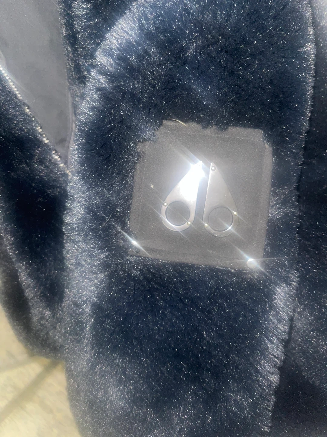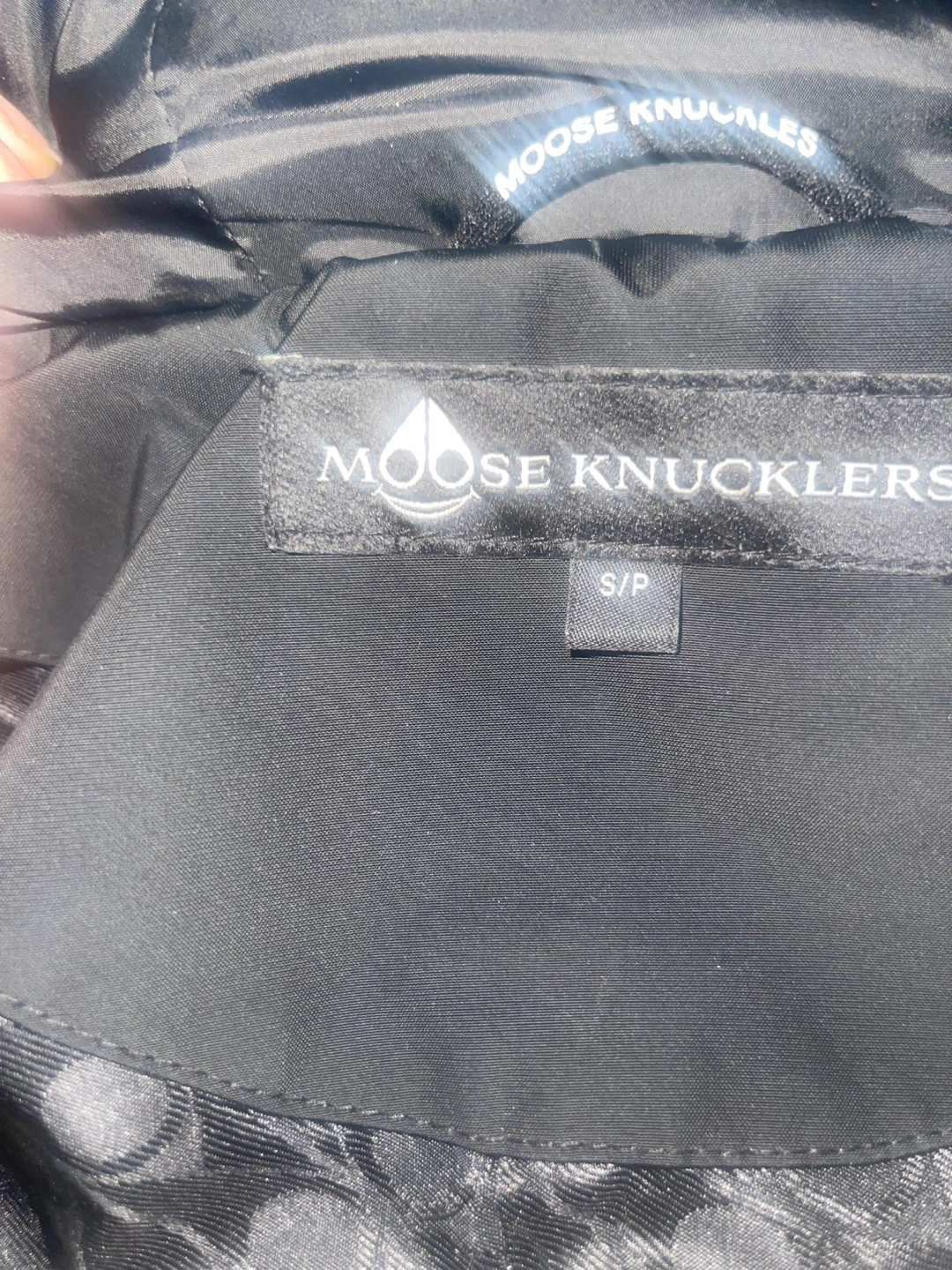 Black Moose Knuckles jacket with a faux fur hood and lining. It's a size S/P with a zippered front. The inner lining features a subtle logo pattern. Kids moose bunny girl price is negotiable sirious buyers only
