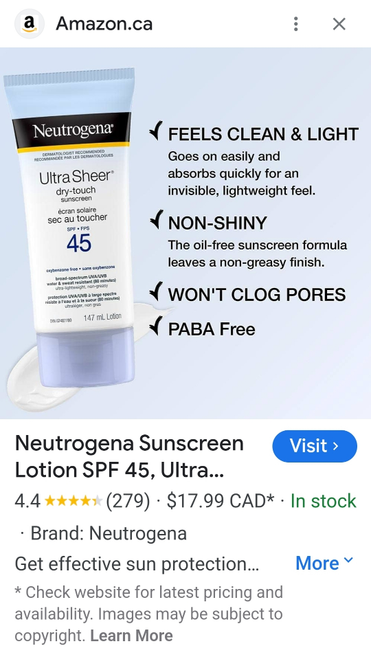 This is a bottle of Neutrogena Ultra Sheer Dry-Touch Sunscreen SPF 60 It is 88ml and is oil-free, PABA free, and won't clog pores. It is also water and sweat resistant for up to 80 minutes.