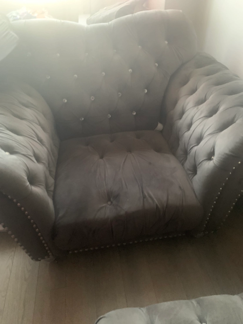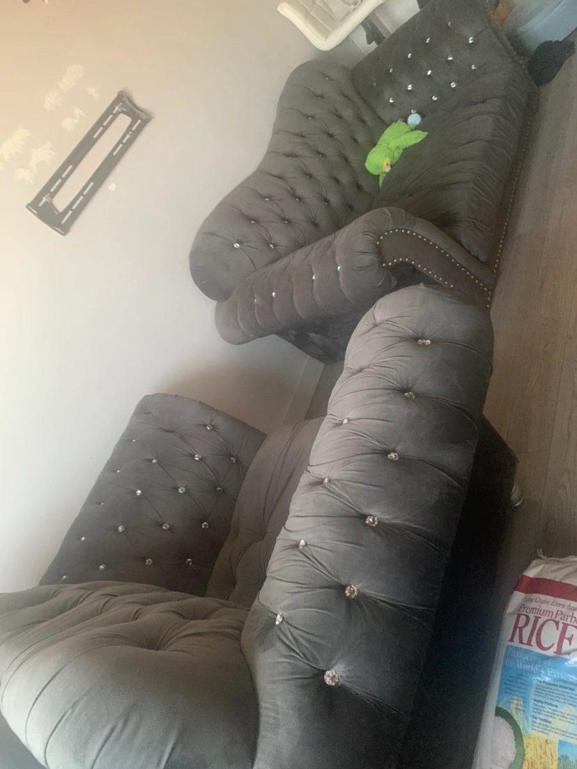 This sofa and loveseat set is a beautiful grey velvet with a tufted design. It has crystal-like buttons and studded trim. It is in great condition.
