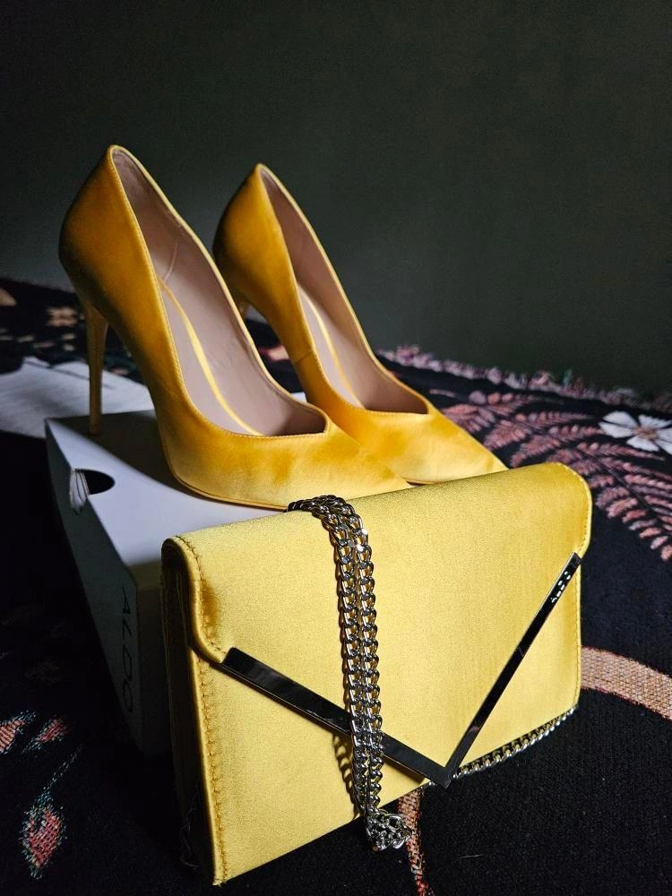 A pair of yellow Aldo high heels (worn for a total of 5 minutes) and a matching clutch with removable chain strap.