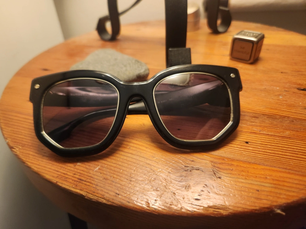 Black sunglasses with gold accents and the Burberry logo on the side. Made in Italy. bought for more than 400, but eyesight is going so, no use for them now. Hope they go to a nice person :)