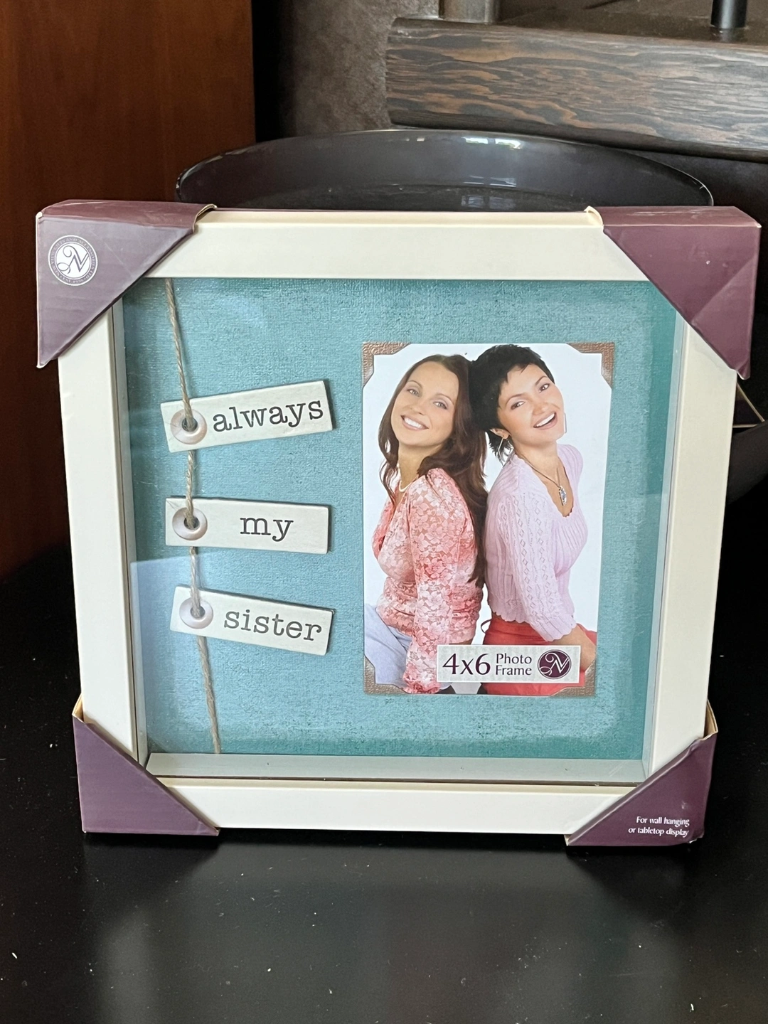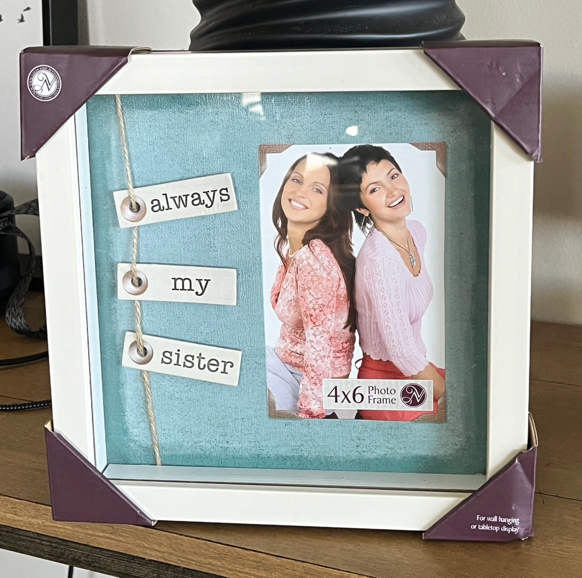 A white 4x6 photo frame with a teal background and twine with the words "always my sister" strung on it. The frame is for wall hanging or tabletop display.
