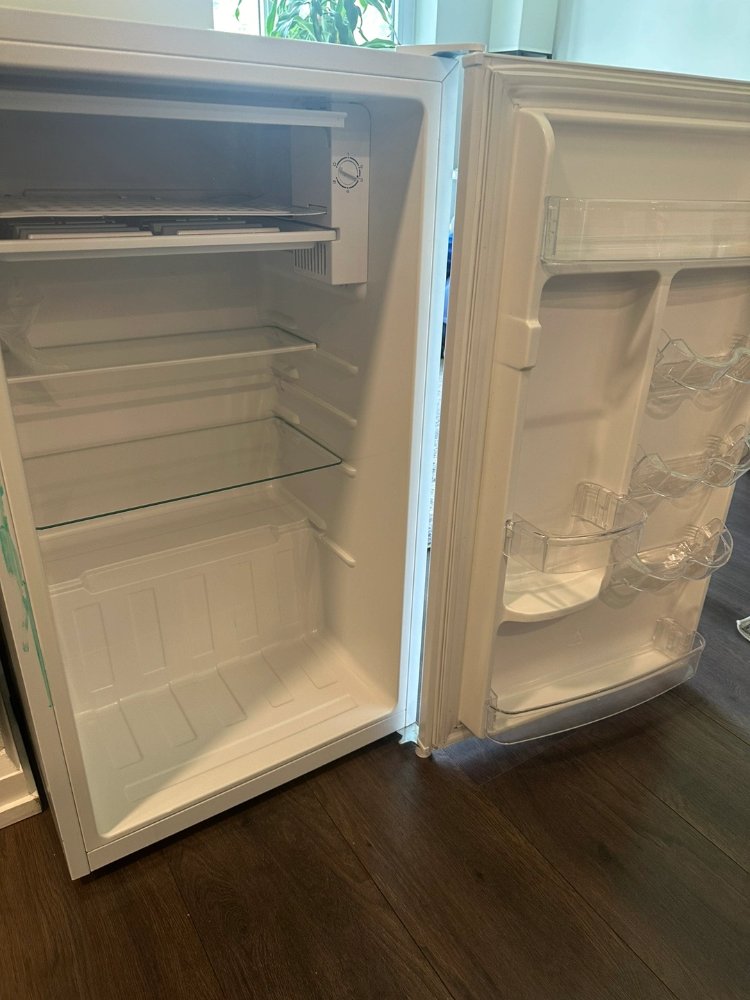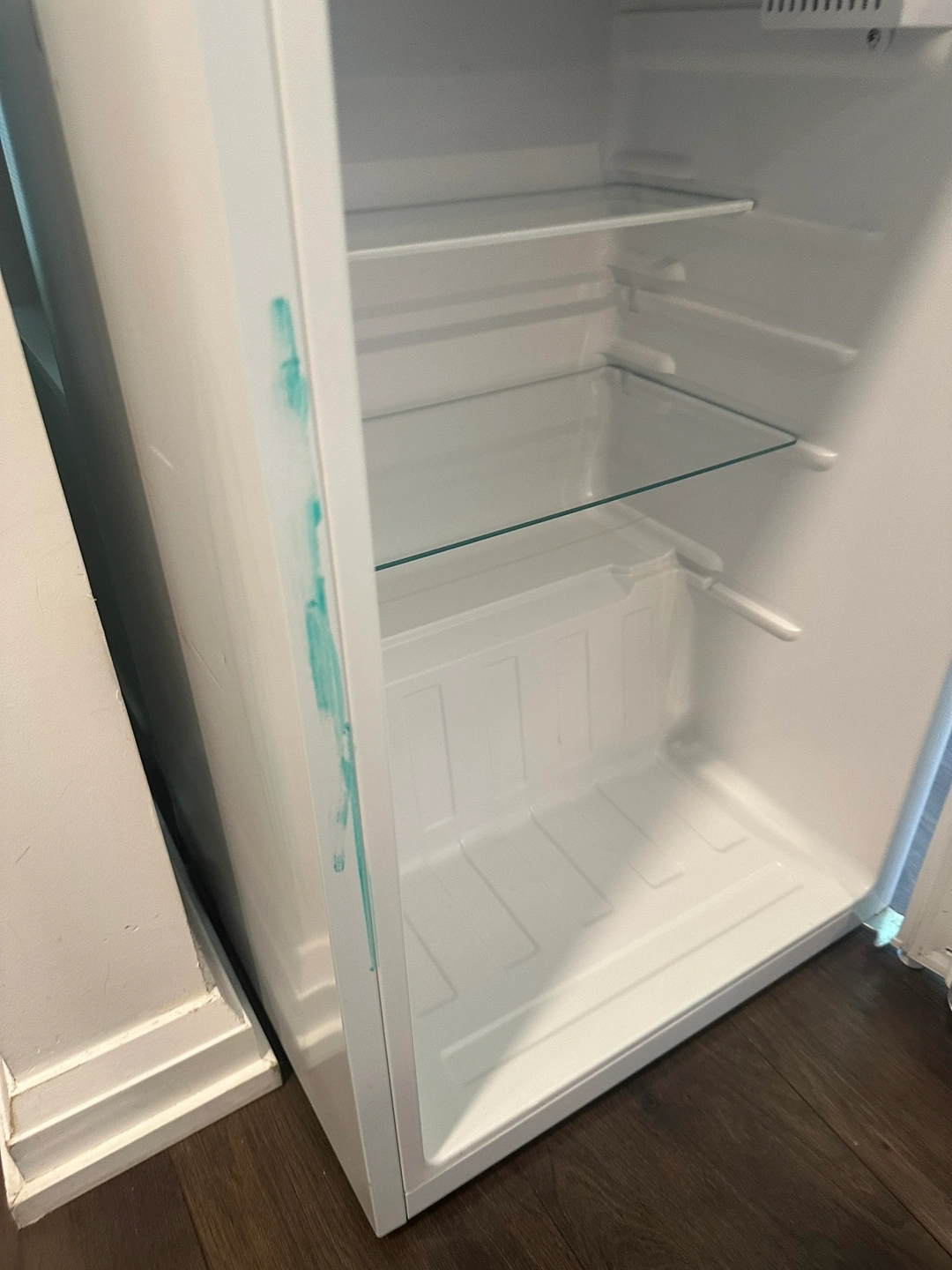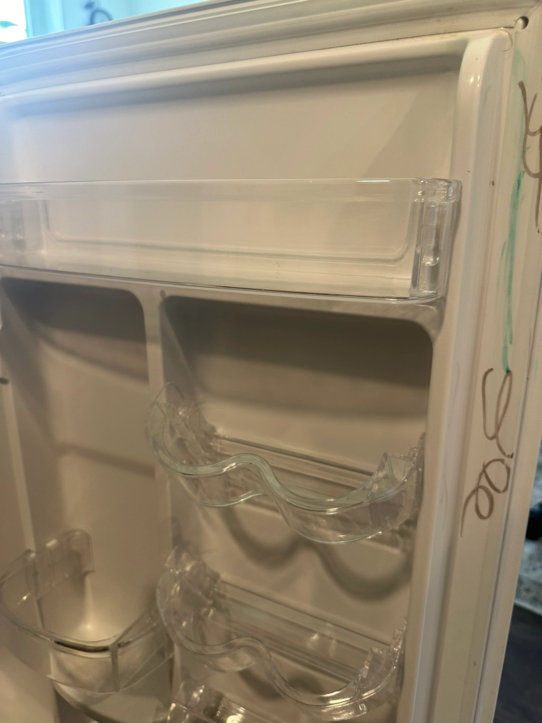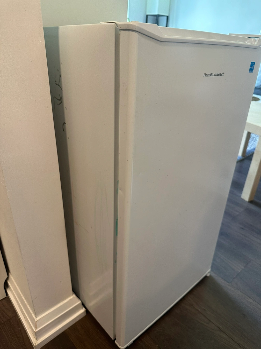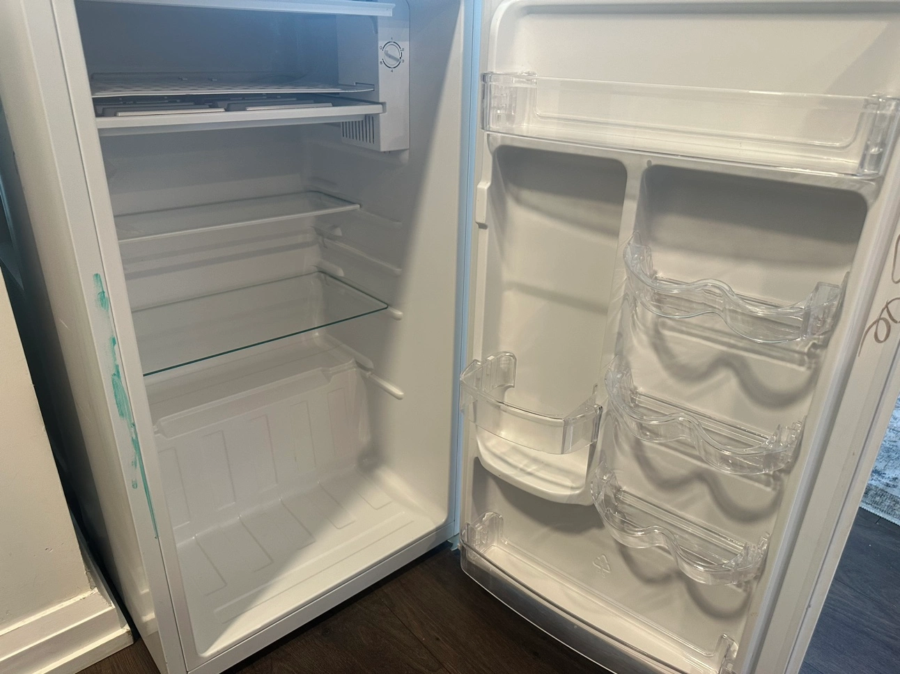 511Price is fixed so please do not ask me for a lower price. Thank you! Small white mini fridge, perfect for a dorm or small apartment. Comes with 2 shelves, spots for cans, and a freezer compartment. Good working condition. There are some marker scribbles on the side (please see pictures). Buyer must pick up!