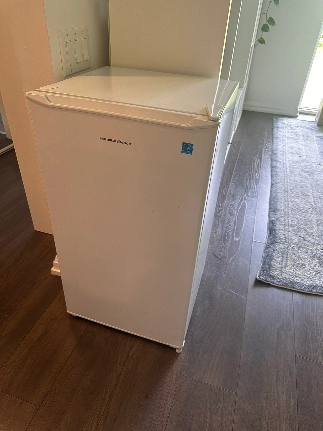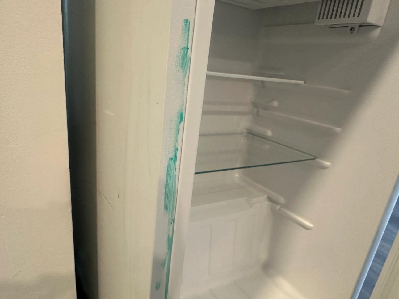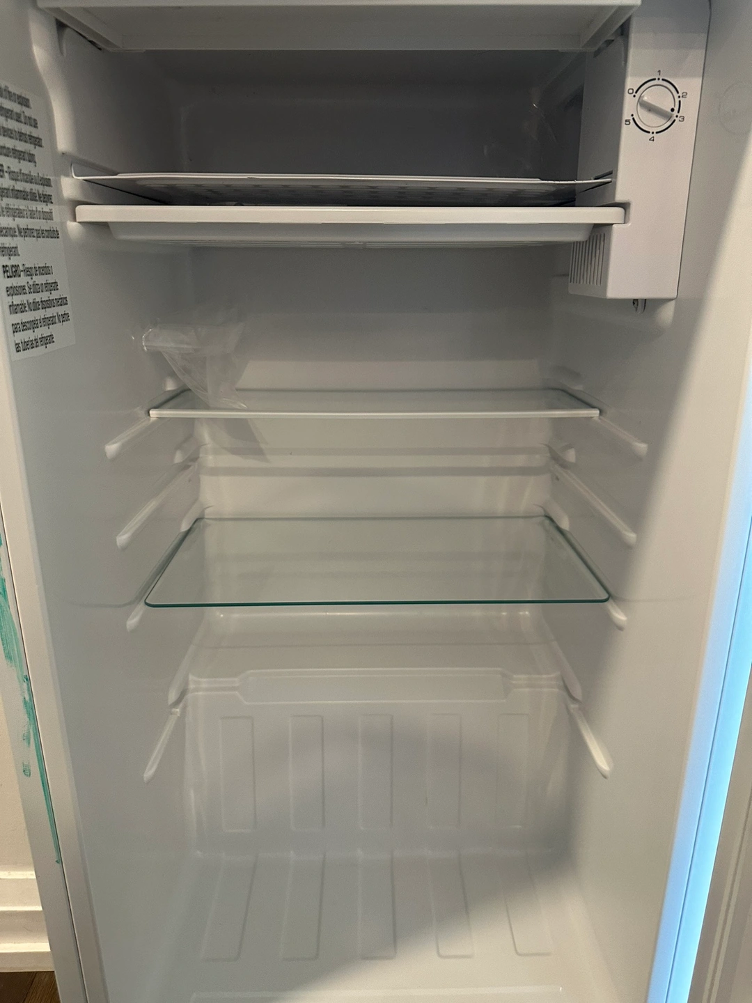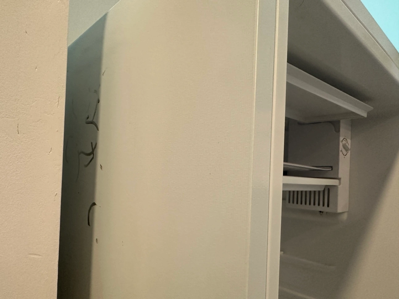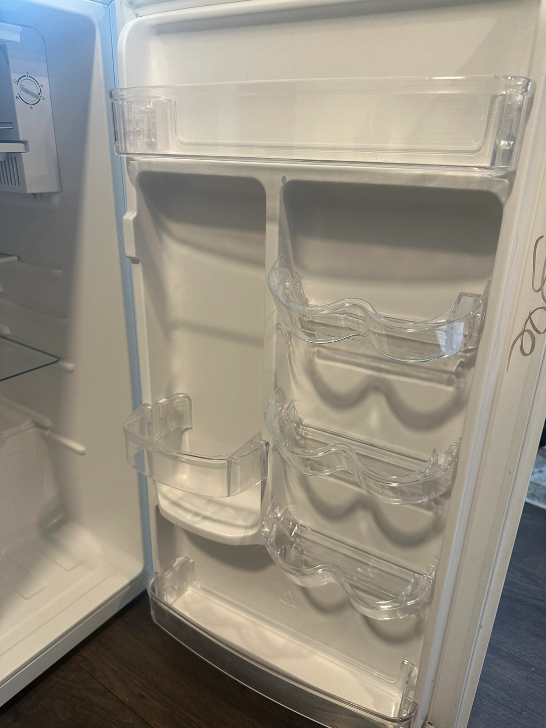 511Price is fixed so please do not ask me for a lower price. Thank you! Small white mini fridge, perfect for a dorm or small apartment. Comes with 2 shelves, spots for cans, and a freezer compartment. Good working condition. There are some marker scribbles on the side (please see pictures). Buyer must pick up!