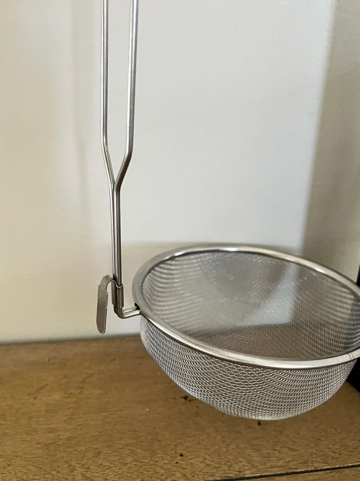 A stainless steel strainer with a handle that can be used to hang it on a pot or pan. It is perfect for straining pasta, vegetables, and other foods.