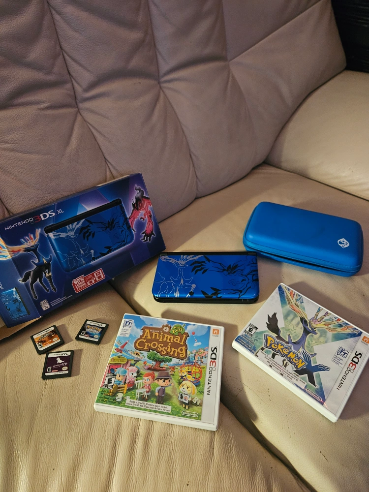 Nintendo 3DS XL system. Comes with various games, including Animal Crossing: New Leaf and Pokemon X. There is also a blue case for the system. Comes with original box and charger.