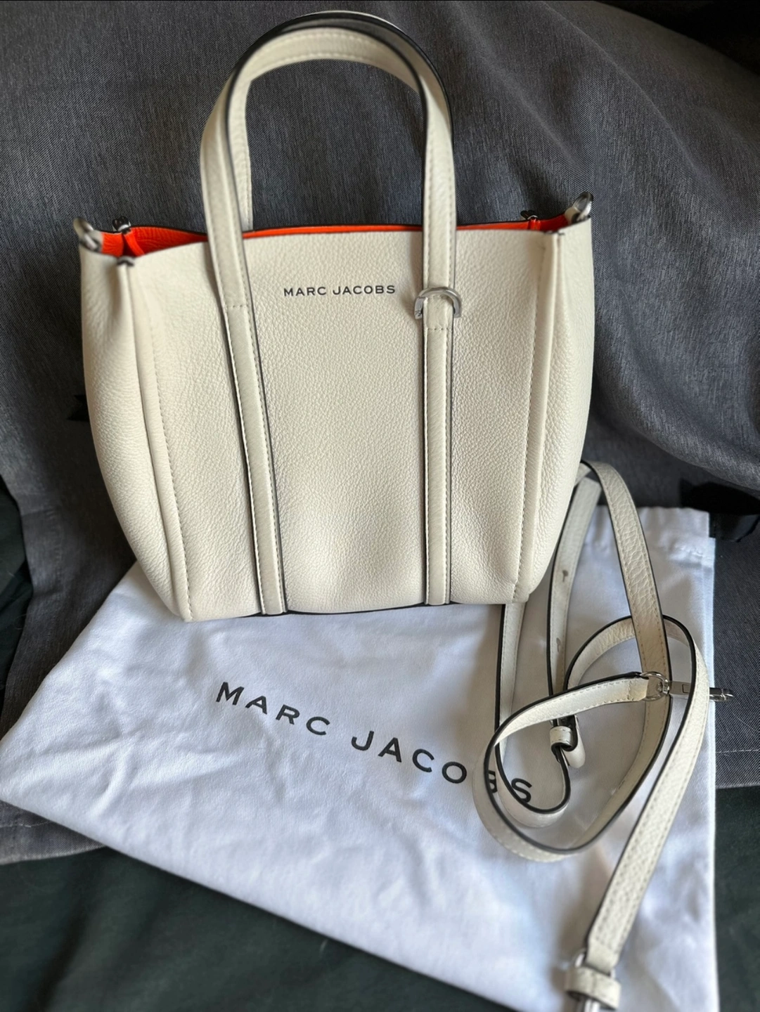 Small warm white/beige leather tote bag with neon orange interior. Comes with a detachable shoulder strap + dust bag