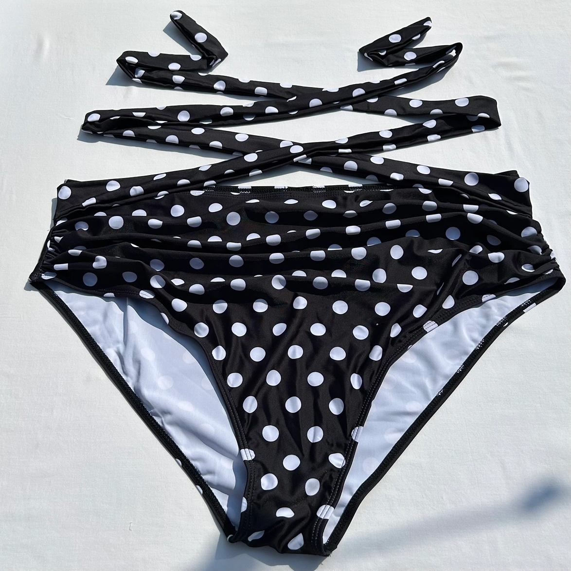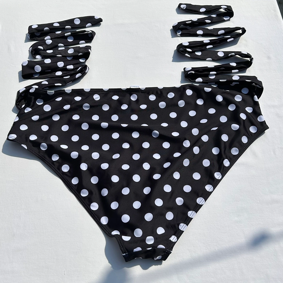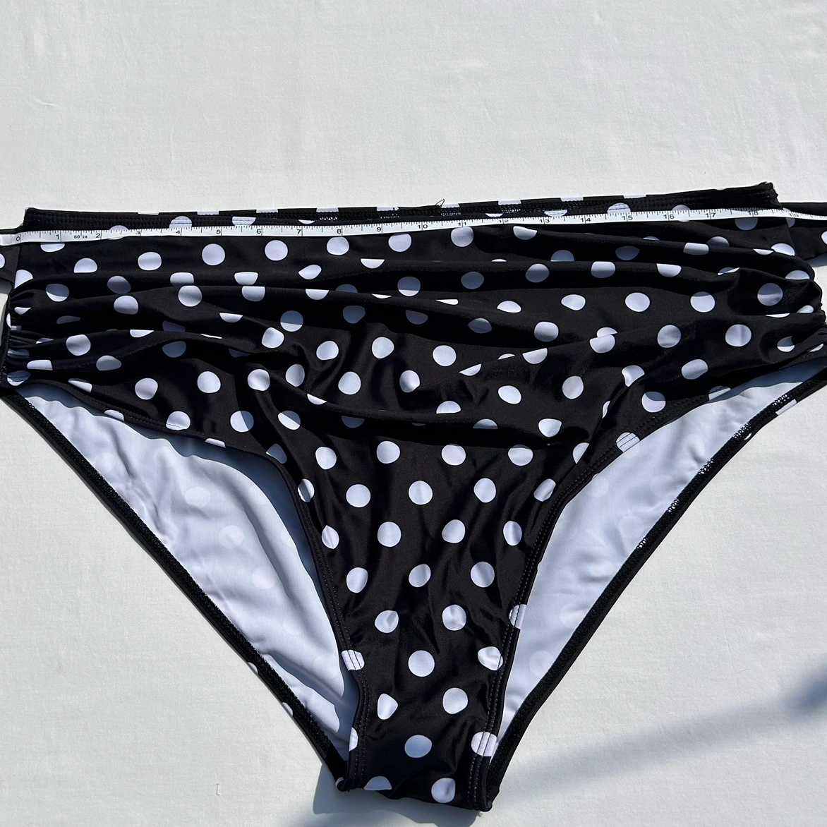 Black and white polka dot bikini swimsuit bottoms. Wrap tie style belt attached to each side. Ruched front. Hardly worn. No size tag but I believe there a size XXL. See photos for measurements. Cross posted.