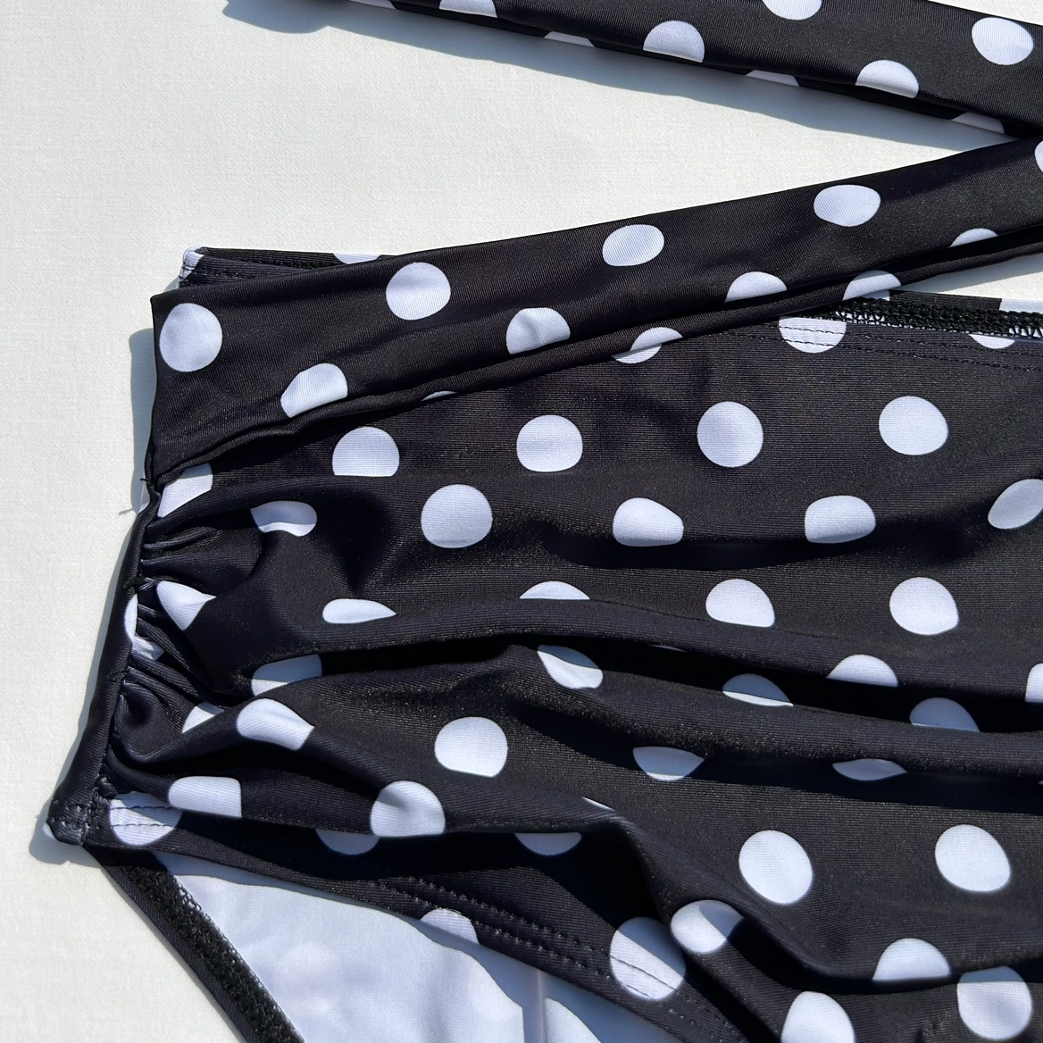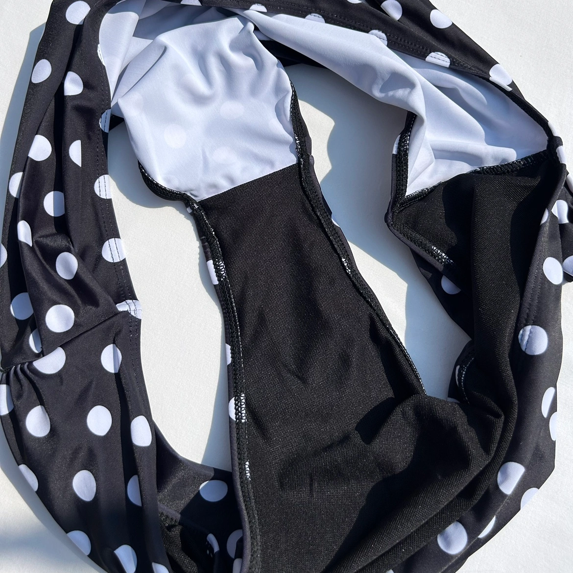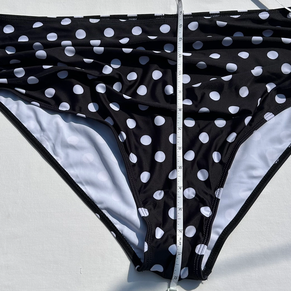 Black and white polka dot bikini swimsuit bottoms. Wrap tie style belt attached to each side. Ruched front. Hardly worn. No size tag but I believe there a size XXL. See photos for measurements. Cross posted.