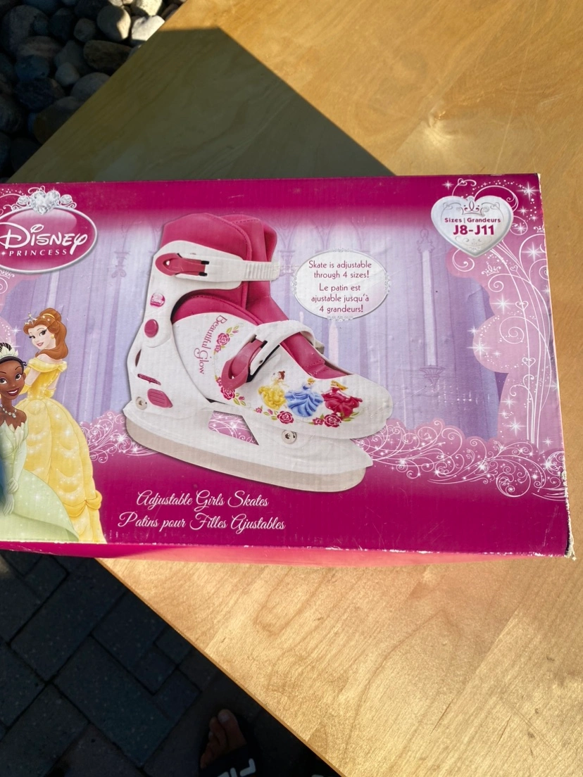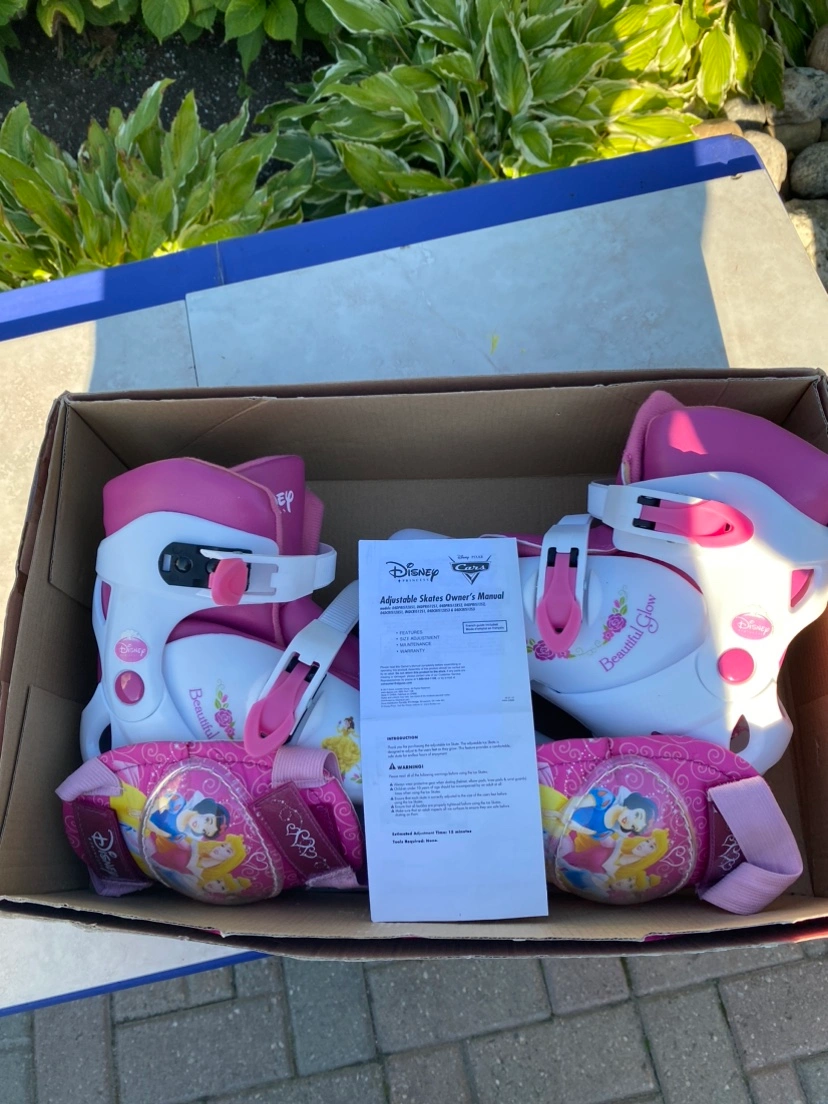 Adjustable size skates with a princess theme. Includes a manual for assembly and instruction. Suitable for ages 3 and up. Hwy 7 & Pinevalley Area 416-708-3056