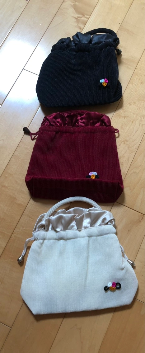 Three corduroy bags in black, red and off-white. All bags feature a satin lining and a small embroidered design. All together for $13 Each: $5 Pick up @ midtown or downtown ! cash only🤗
