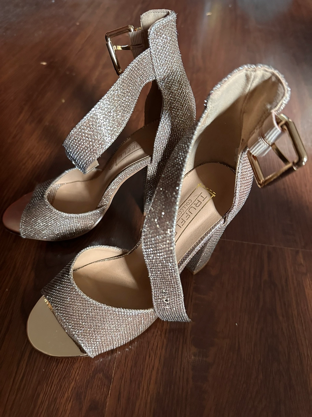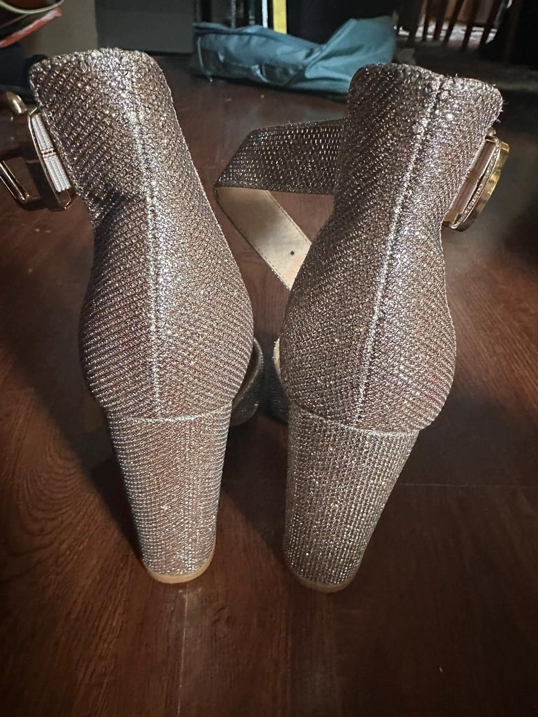 These are a lovely pair of heels in a gold glitter colour. They have a buckle on the ankle strap and a chunky heel. They are great for a night out. They have been worn a few times. Please check the photos carefully as they form part of the description.