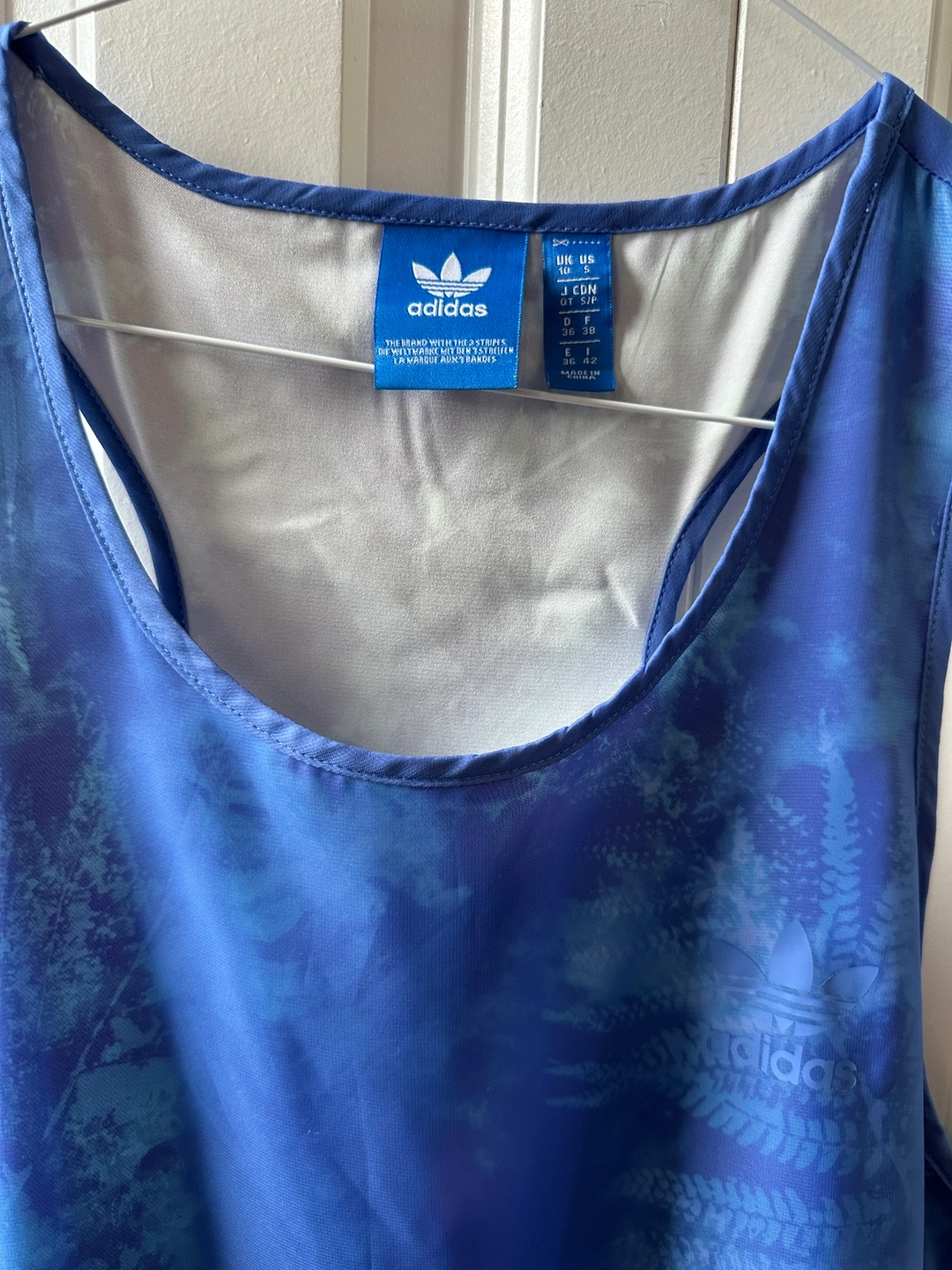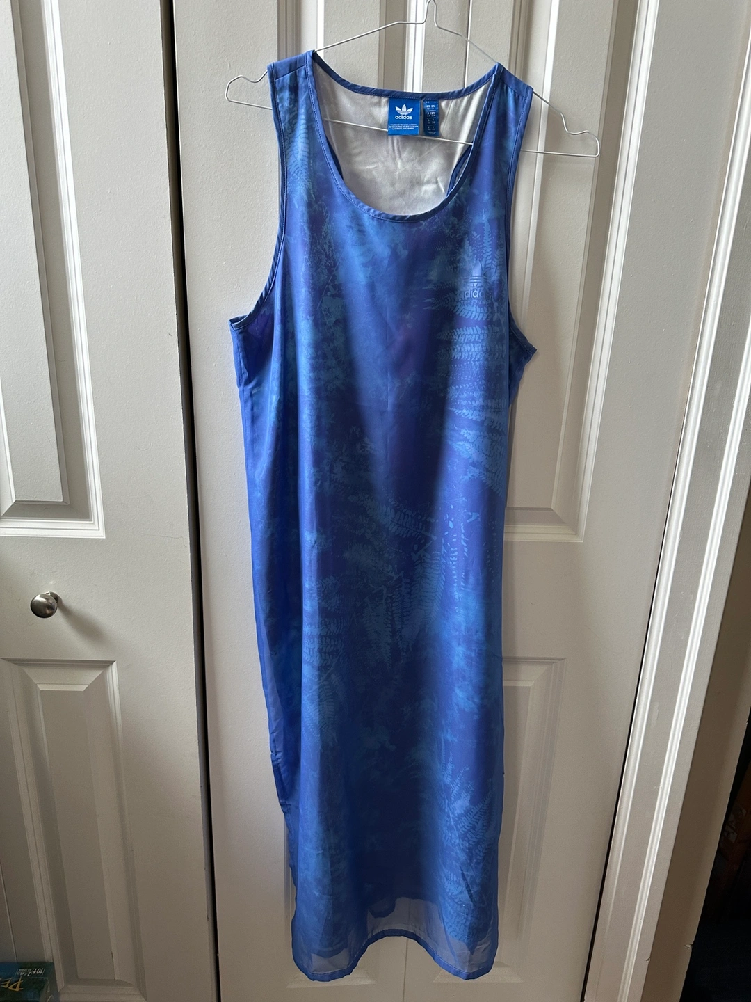 This is a beautiful blue dress, perfect for summer! It is made of a soft and flowy material, and features a fun, abstract print. The dress has a racerback style and It is a great option for a casual day out or a night out on the town.