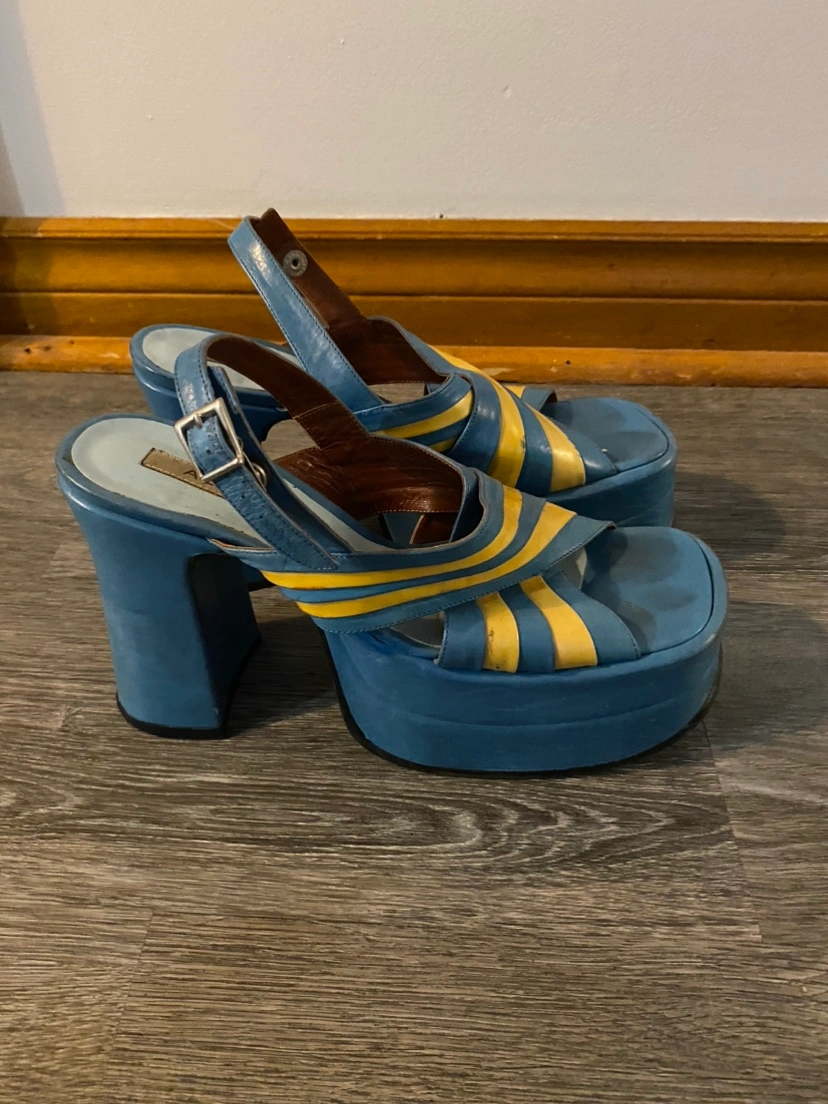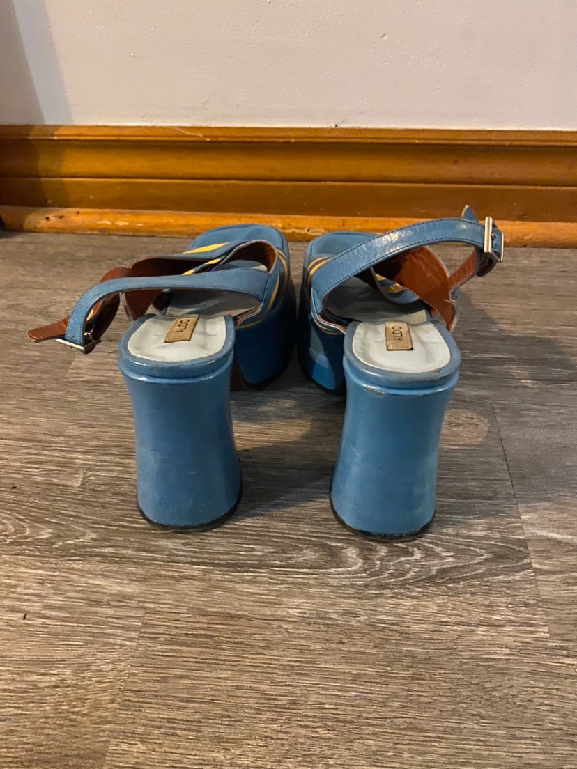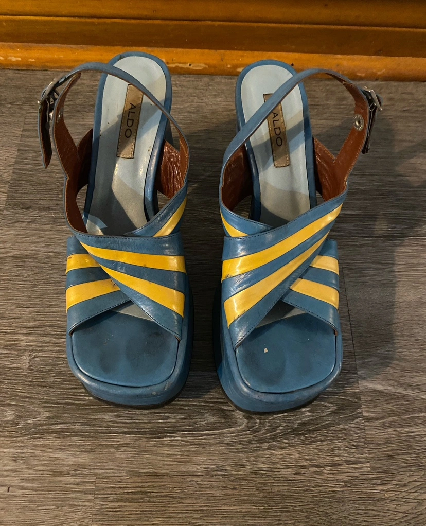 INCREDIBLE vintage from the 90s (but look like theyโre from the 70s) blue and white leather platform sandals from Aldo. 2โ stacked platform at the front and 5โ platform heel, these are some major, major shoes! Made in Spain, never worn.