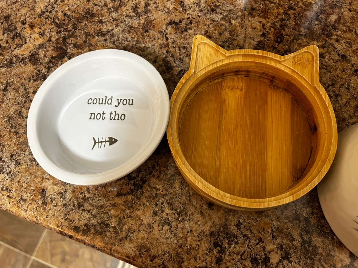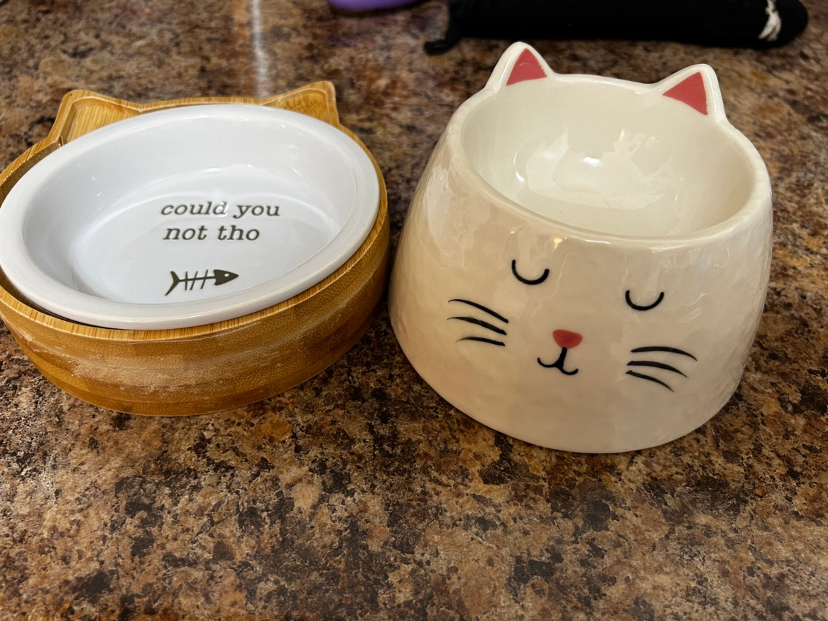 Set of two cat bowls. One is ceramic with a cat face and the other is a ceramic bowl with a bamboo stand that says "could you not tho" with a fish bone.