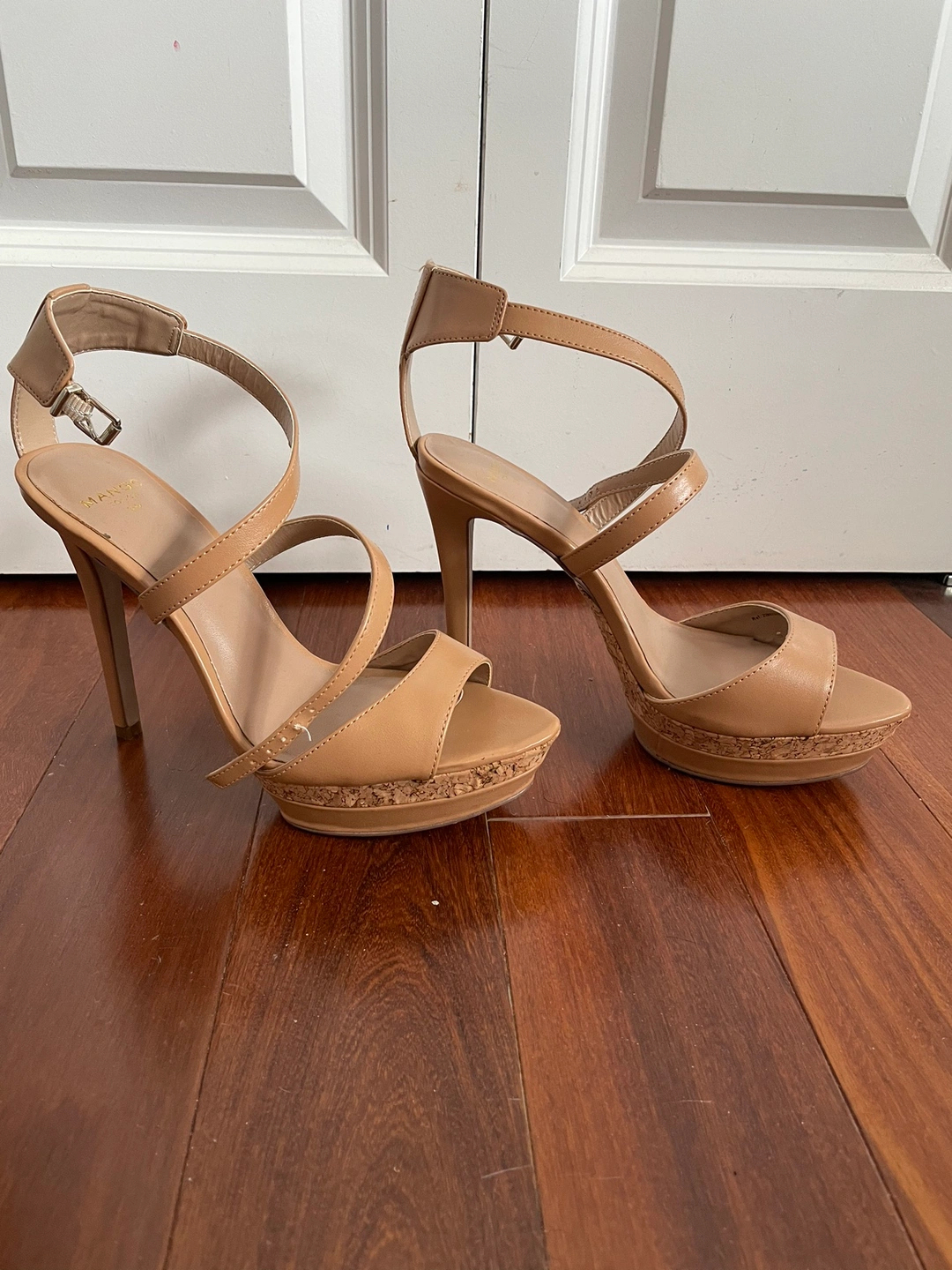 Tan/beige platform heels with an ankle strap.