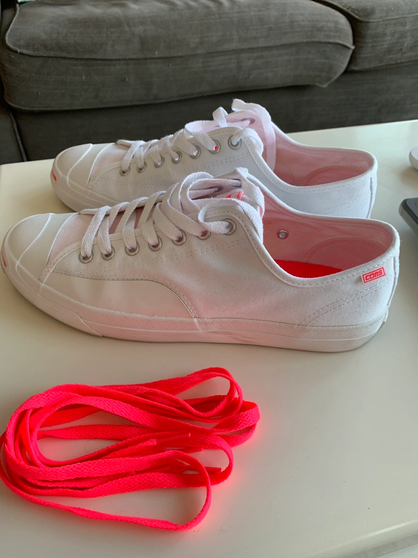 Size 9.5 Men's, white with pink accents, comes with an extra pair of pink laces.