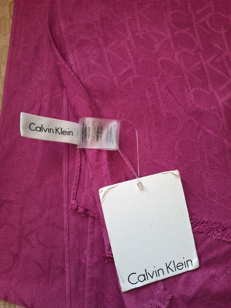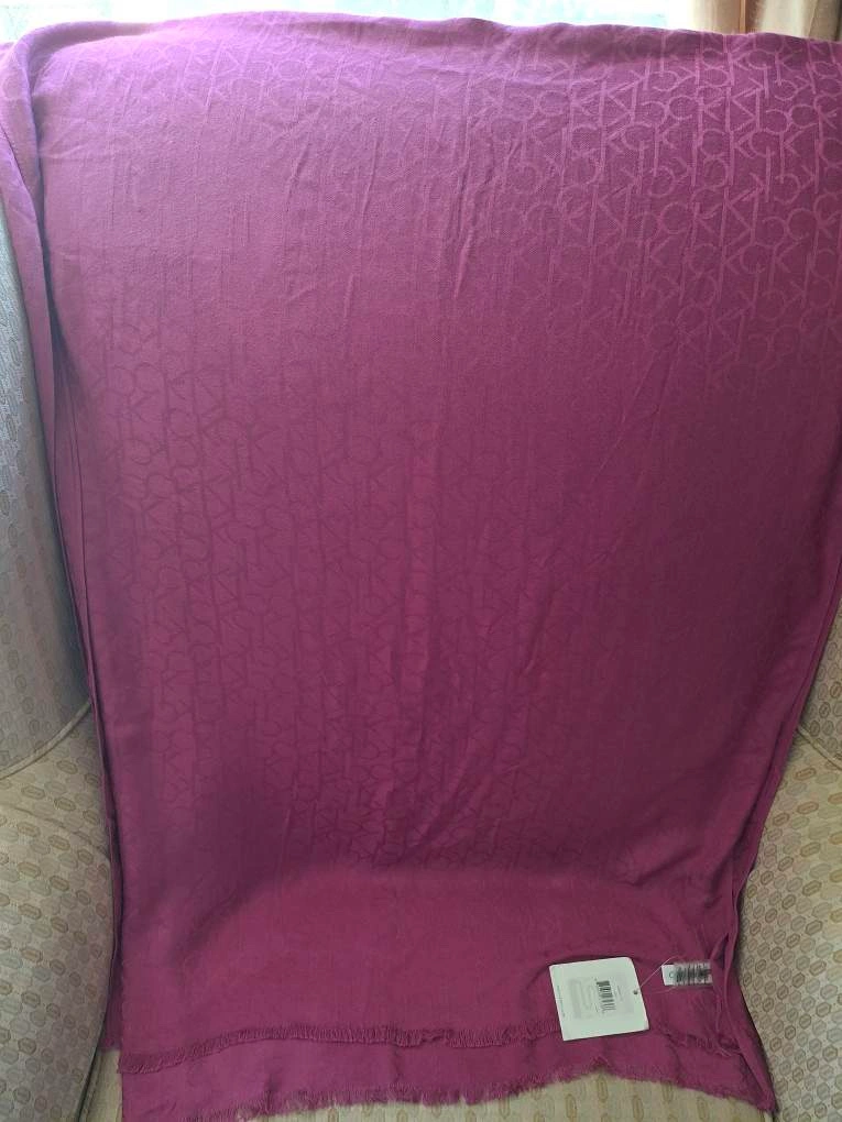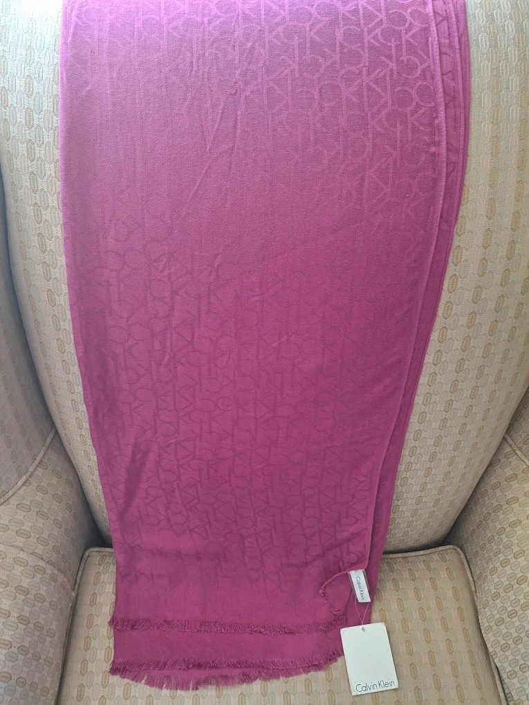 1000+Calvin Klein scarf in a dark pink colour, with a CK logo pattern. It has a fringe trim. 26” x 76” long. Never worn with tags still attached. Available for pickup in Markland Wood.