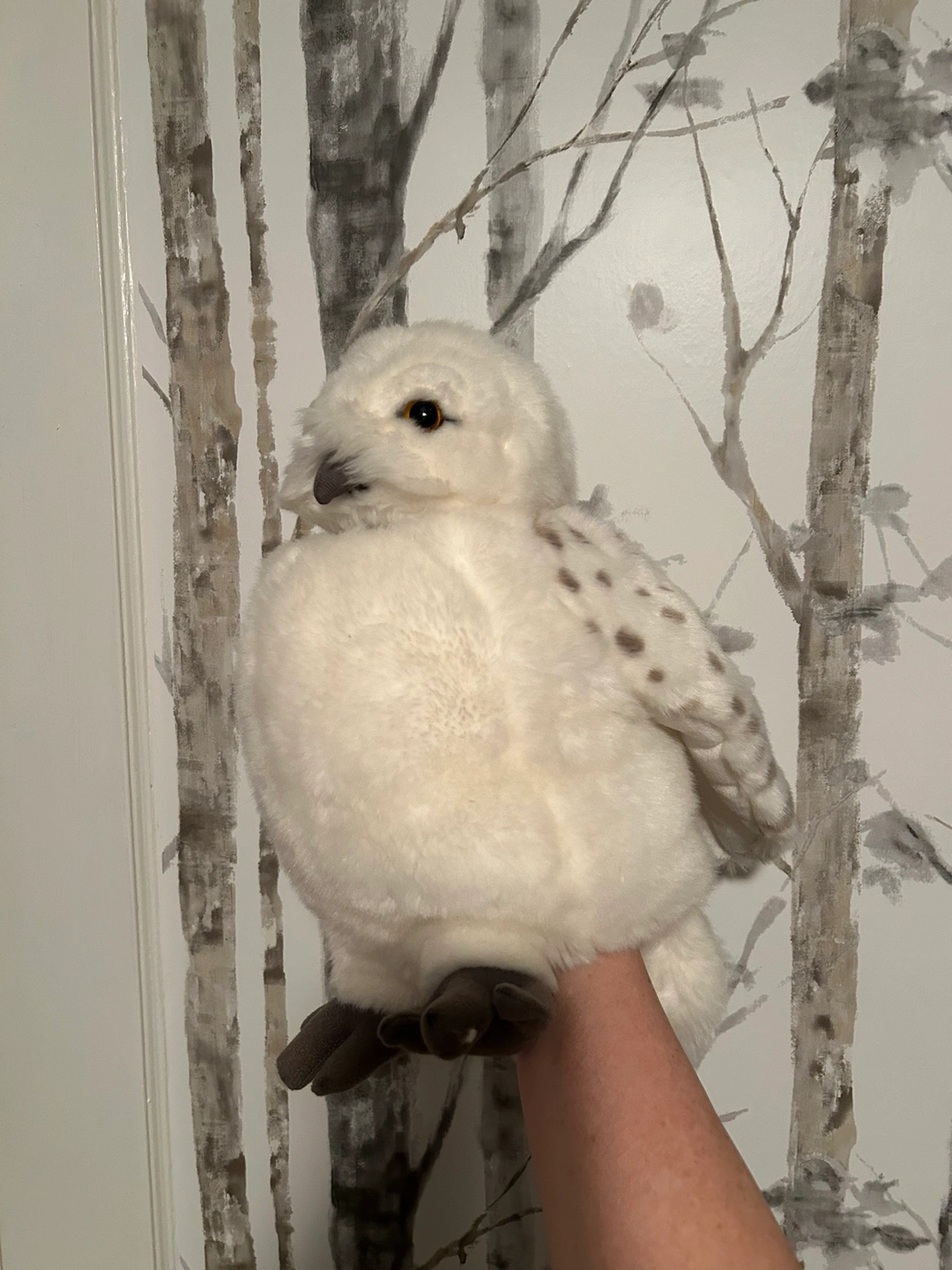 This is a soft plush Hedwig owl puppet from the Harry Potter series. The head swivels 360 degrees and it chirps when you press a hidden button in the wing. It also delivers mail in the wizarding world! π My kids were huge Harry Potter fans but now they are adults so they are giving to a younger Harry Potter fan!