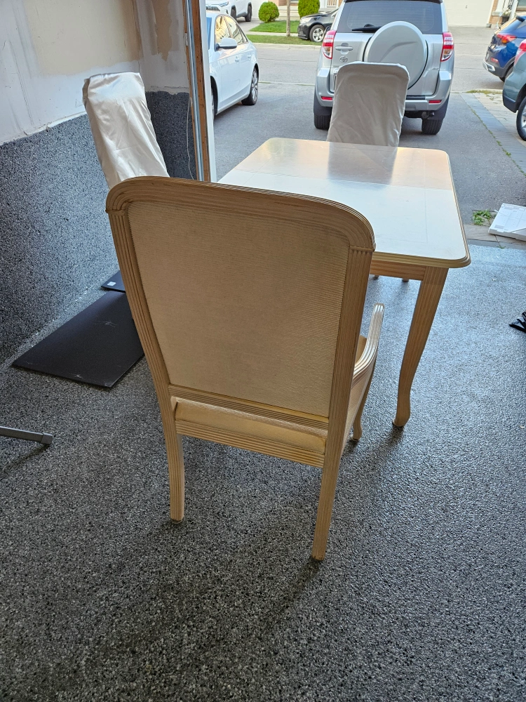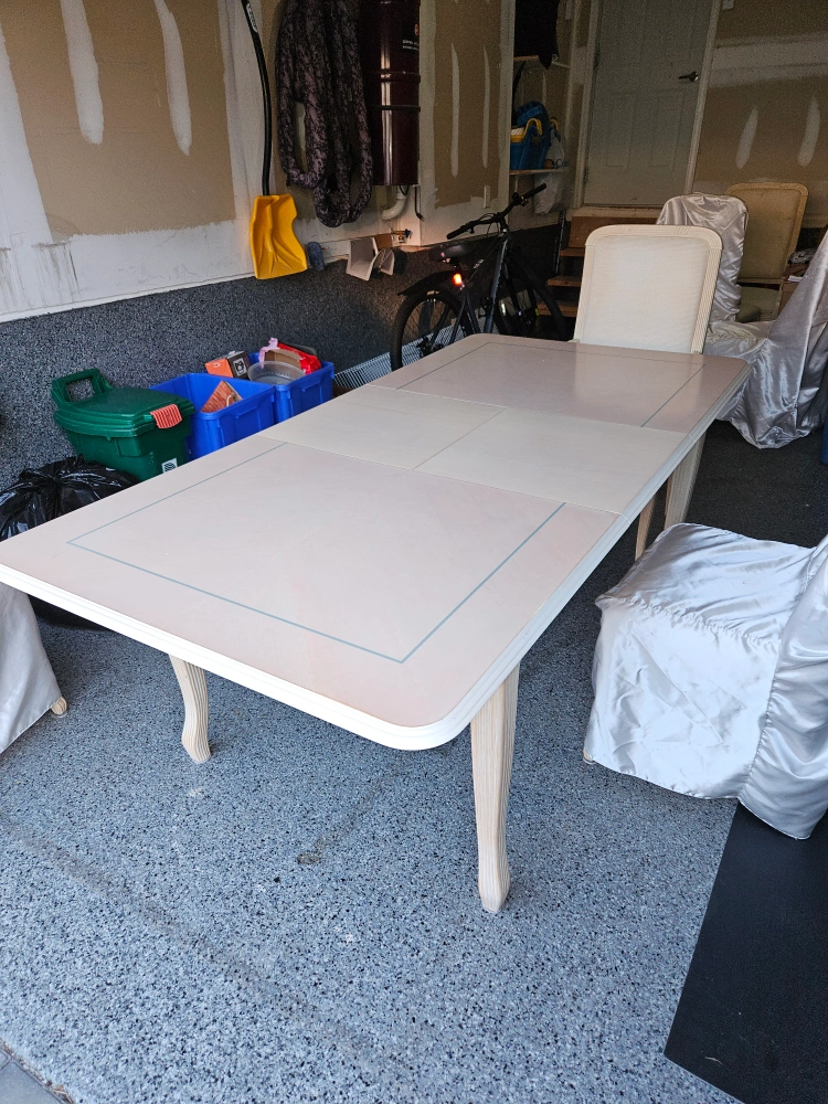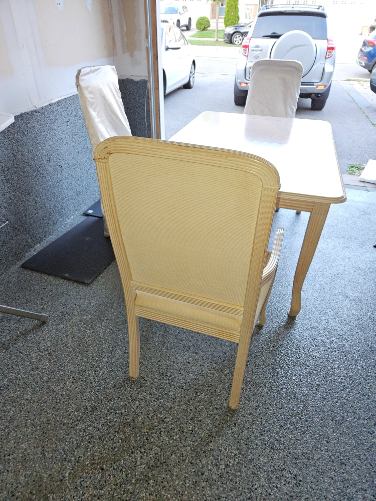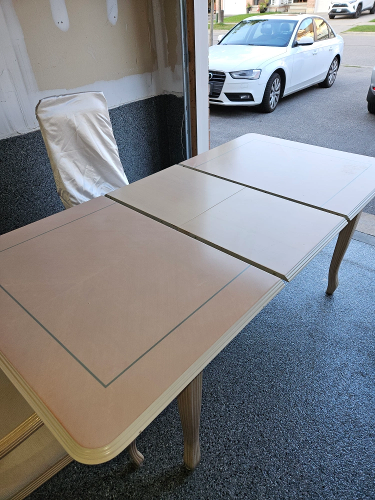 The set includes a table and 4 chairs. The table has a white top with a blue trim. Table extends. Chairs have upholstered seats and backs. It's made of Solid wood and it's really heavy and super sturdy. Since we are moving and don't have space in the new house, need to let go this beautiful set.