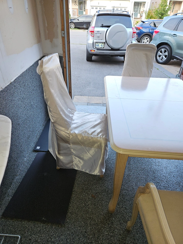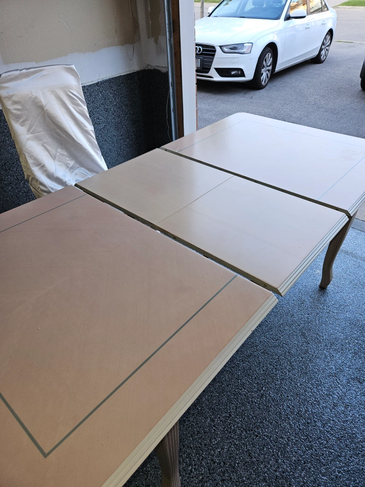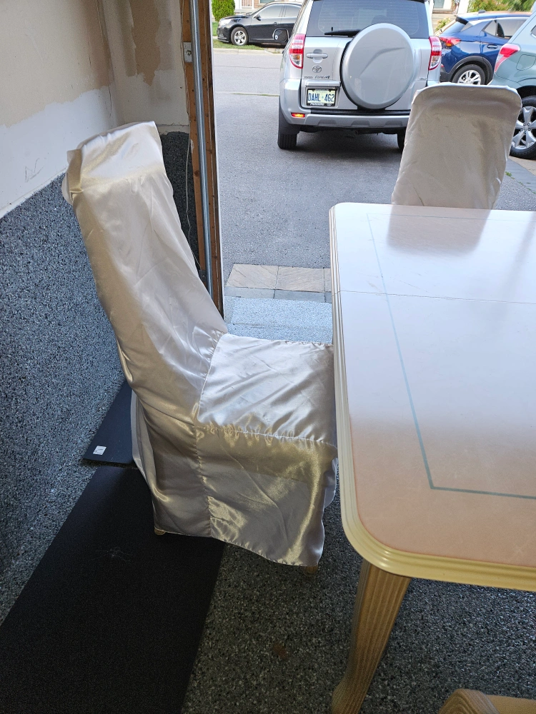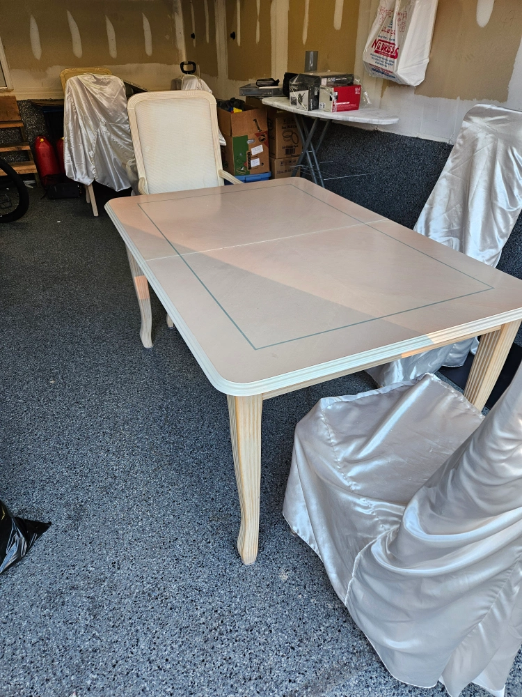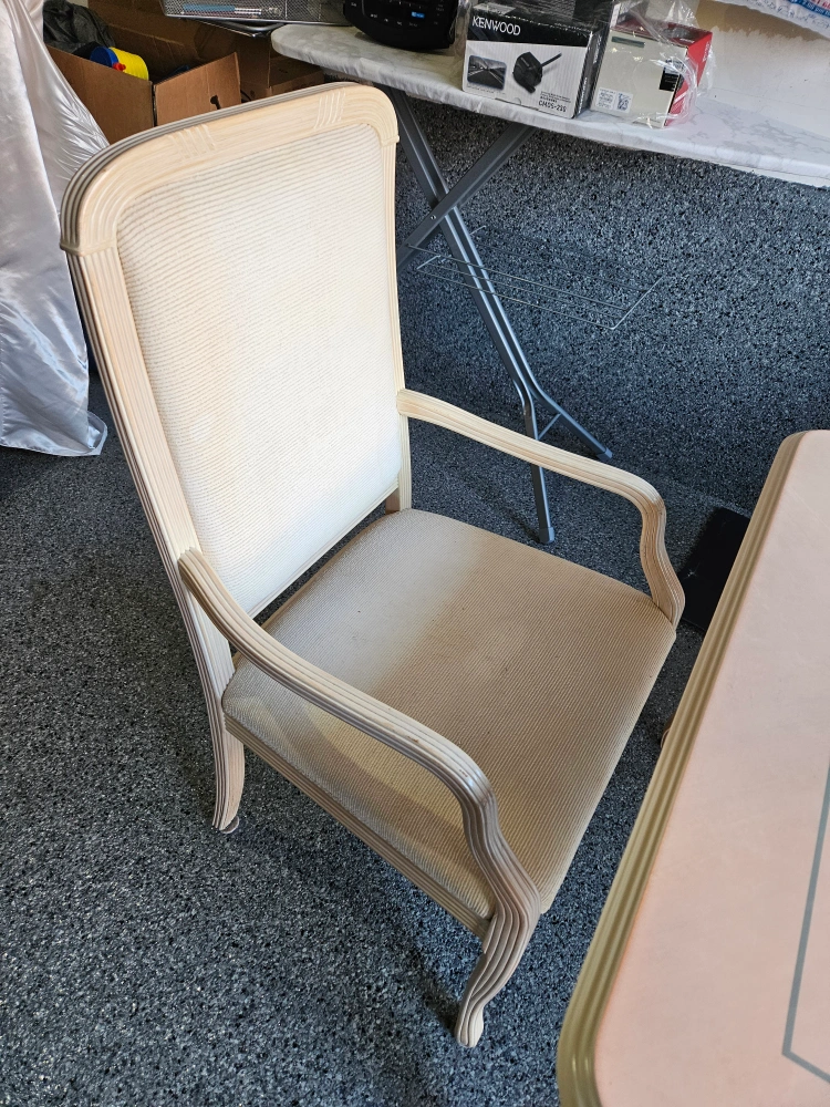 The set includes a table and 4 chairs. The table has a white top with a blue trim. Table extends. Chairs have upholstered seats and backs. It's made of Solid wood and it's really heavy and super sturdy. Since we are moving and don't have space in the new house, need to let go this beautiful set.