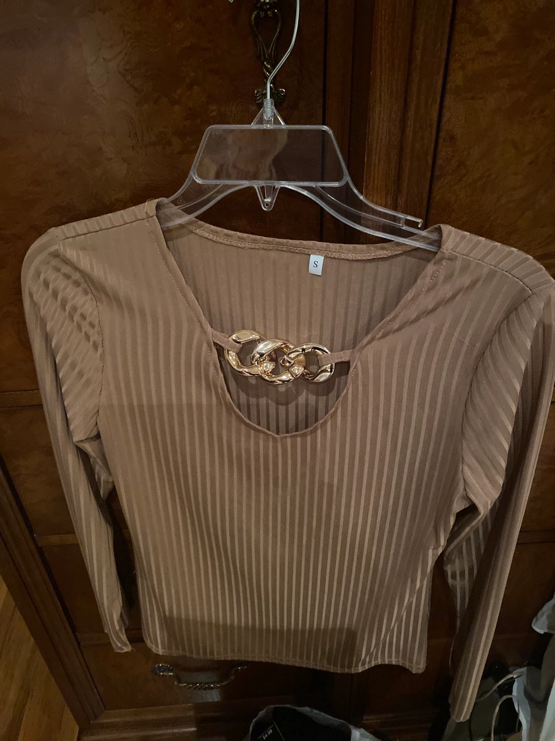 Tan striped long sleeve top with gold chain detail. Size S.