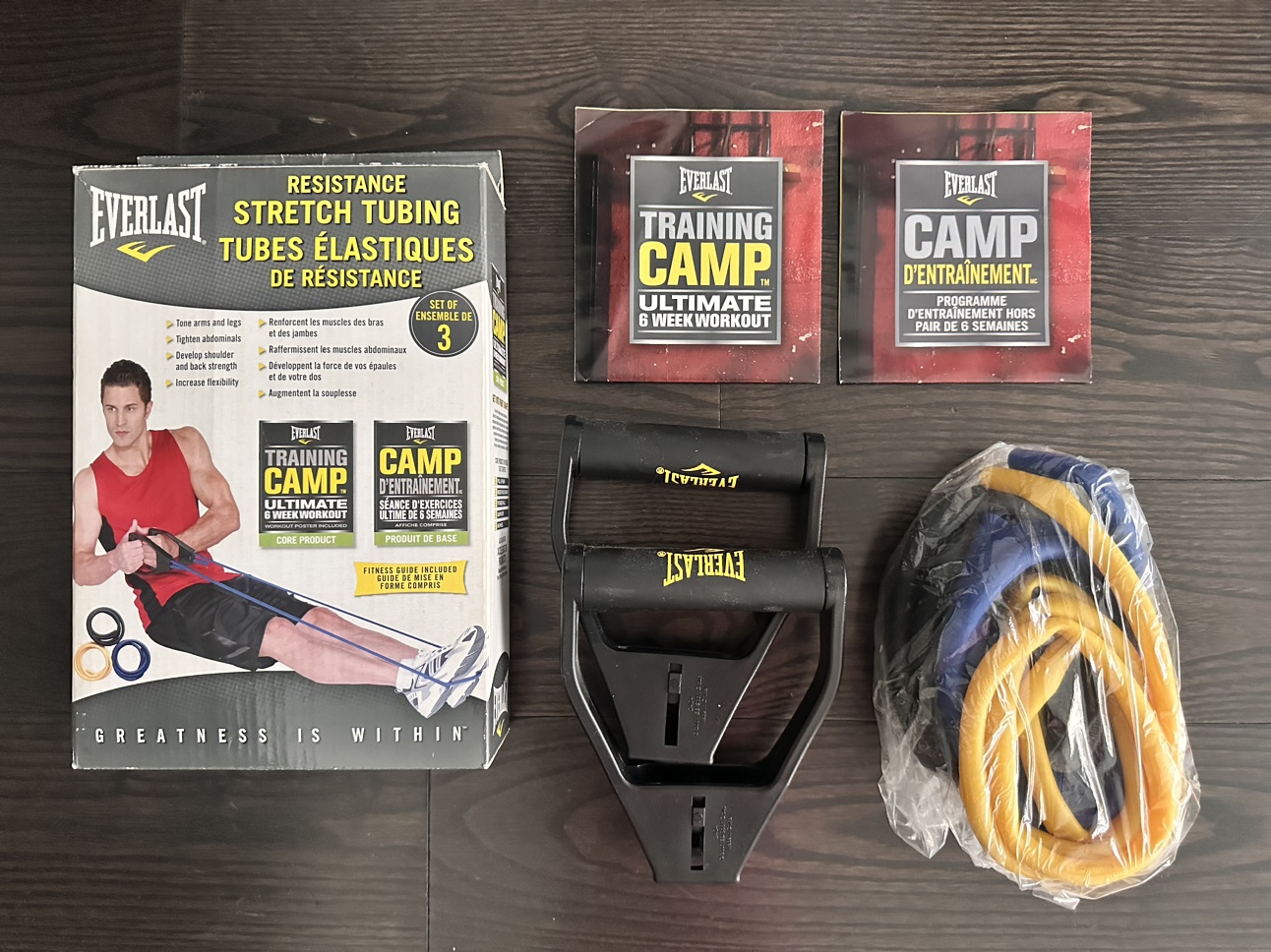 Includes 3 bands, 2 handles and an instruction booklet. The instruction booklet includes workout posters for a 6-week workout program.
