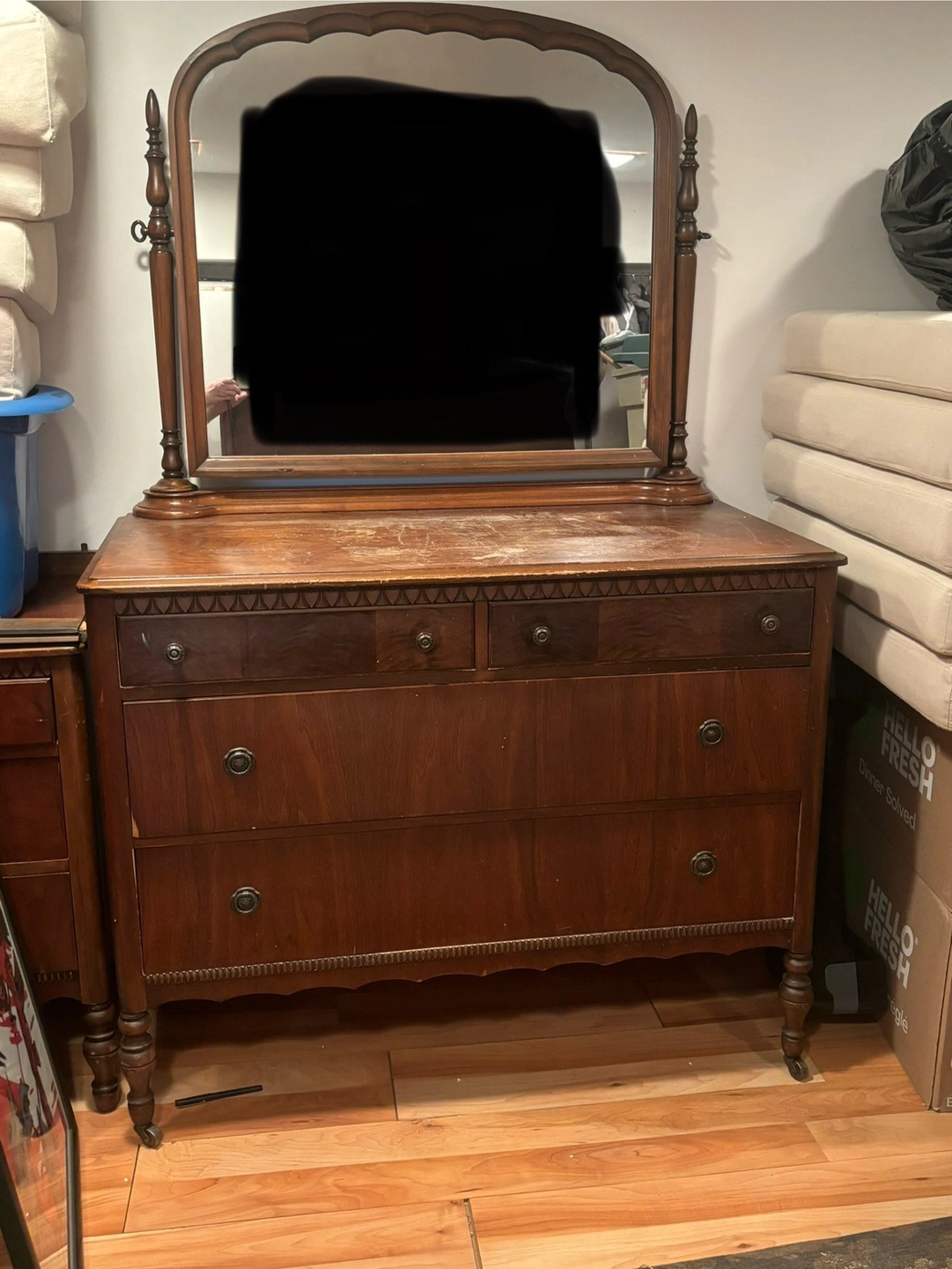 This 1930’s dresser features a large, detachable mirror that pivots. It has four drawers and a solid wood veneer construction with original hardware. Perfect for refinishing, painting or up cycling. Two very large drawers and two small drawers. The large, top surface is perfect for displaying decor or holding your favourite items.