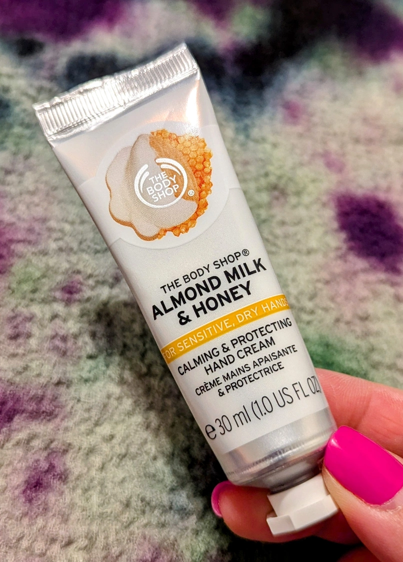 A tube of The Body Shop Almond Milk & Honey Hand Cream for sensitive and dry hands.