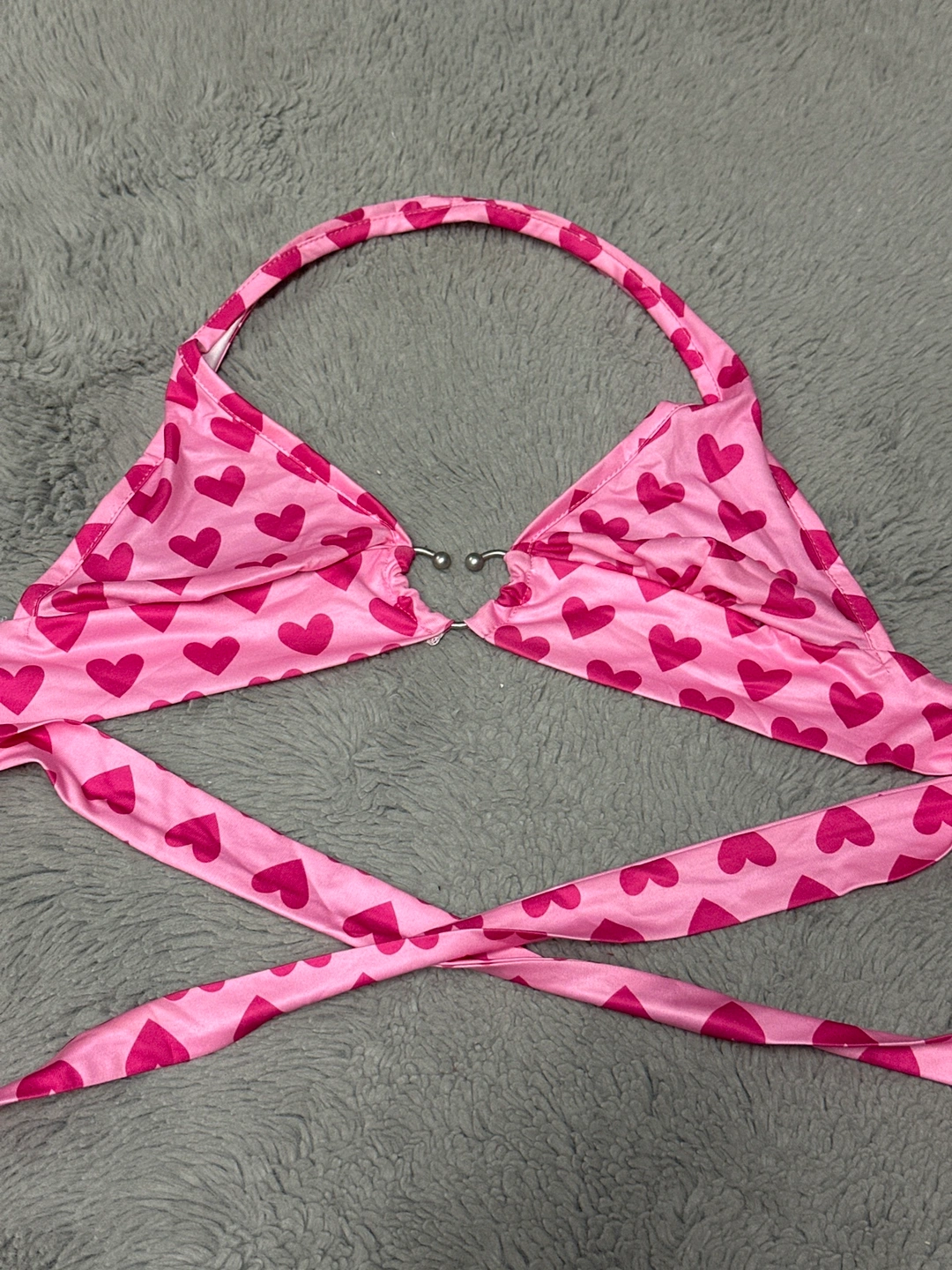 This is a pink halter top with a heart print and a metal ring on the front. The straps are adjustable and can be tied at the back. The top is in good condition.