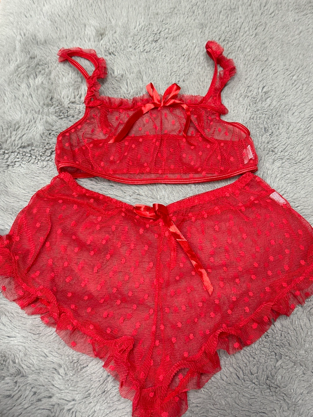 Red polka dotted lingerie set with a bra and shorts. Both pieces have ruffle detailing. The bra has a bow at the front. The set is made of a sheer mesh material. It is in good condition.