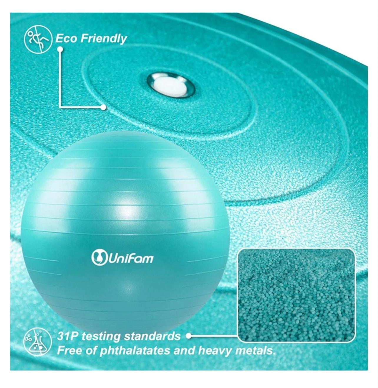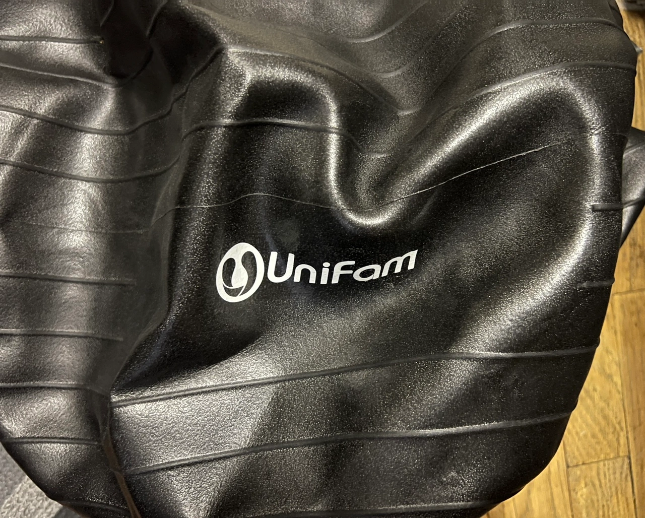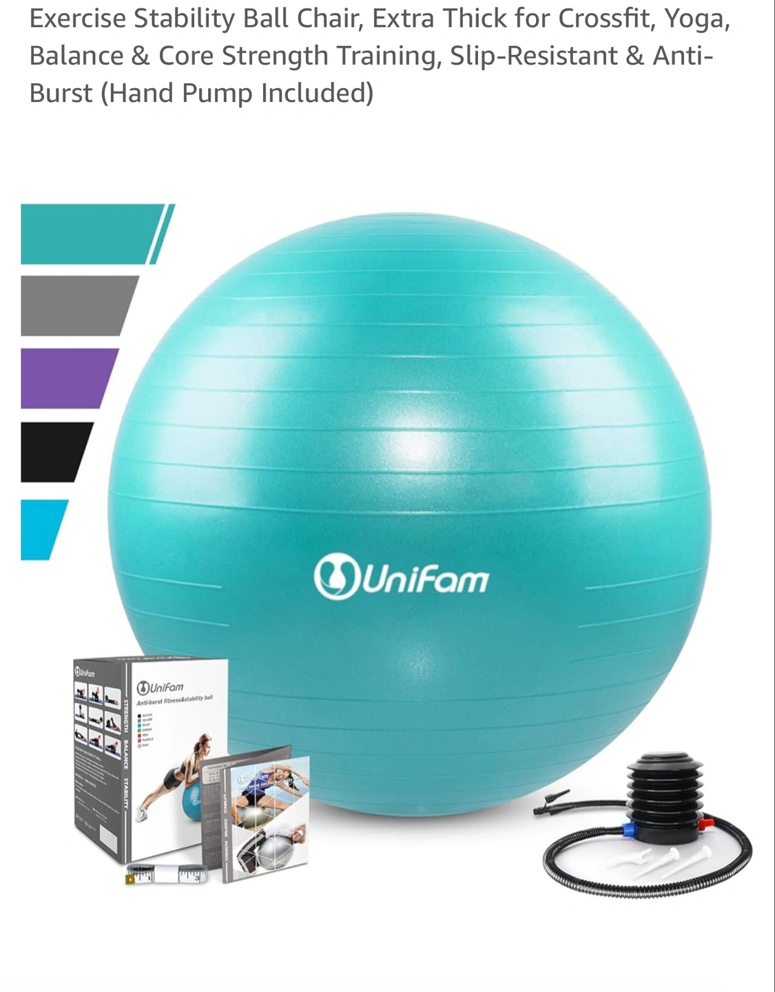 This is a black exercise stability ball chair with the UniFam logo. It does not have the hand pump. It's designed to be used for CrossFit, Yoga, Balance and Core Strength Training. It's also slip-resistant and anti-burst. Had in storage and deflated to store but now clearing everything out. We can inflate so you can see it holds air.