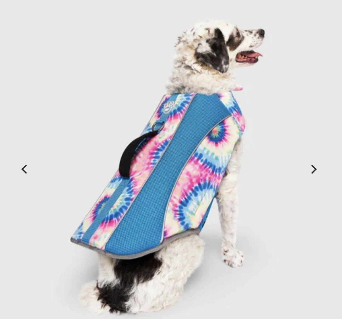 "Bright and functional Wave Rider dog life jacket by Canada Pooch, featuring a colourful tie-dye design with breathable mesh panels, adjustable straps, and a sturdy top handle for easy lifting.