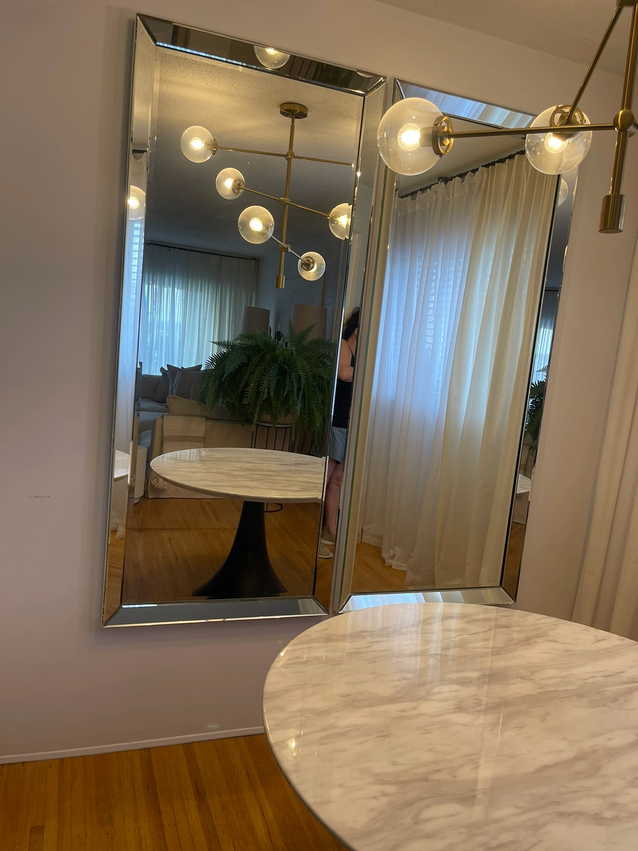 Large bevelled mirror on mirror, floor or wall mount vertical or horizontal. Heavy.